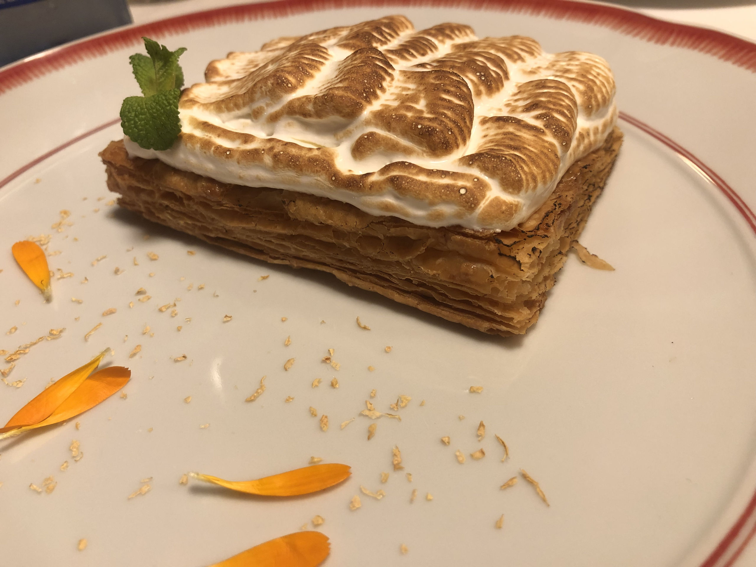 Muy buena la tarta de hojaldre de limón y merengue tostado.