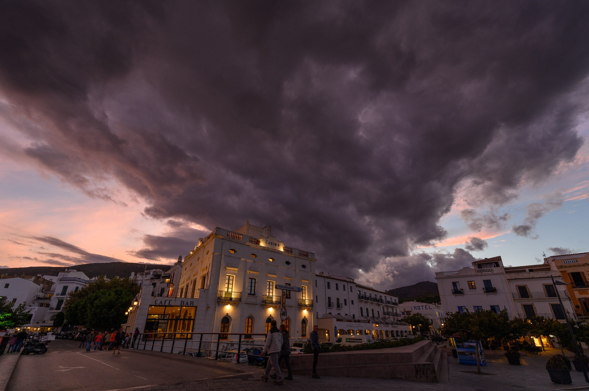 Una amenazante nube sobre el bonito edificio del viejo casino de Cadaqués.