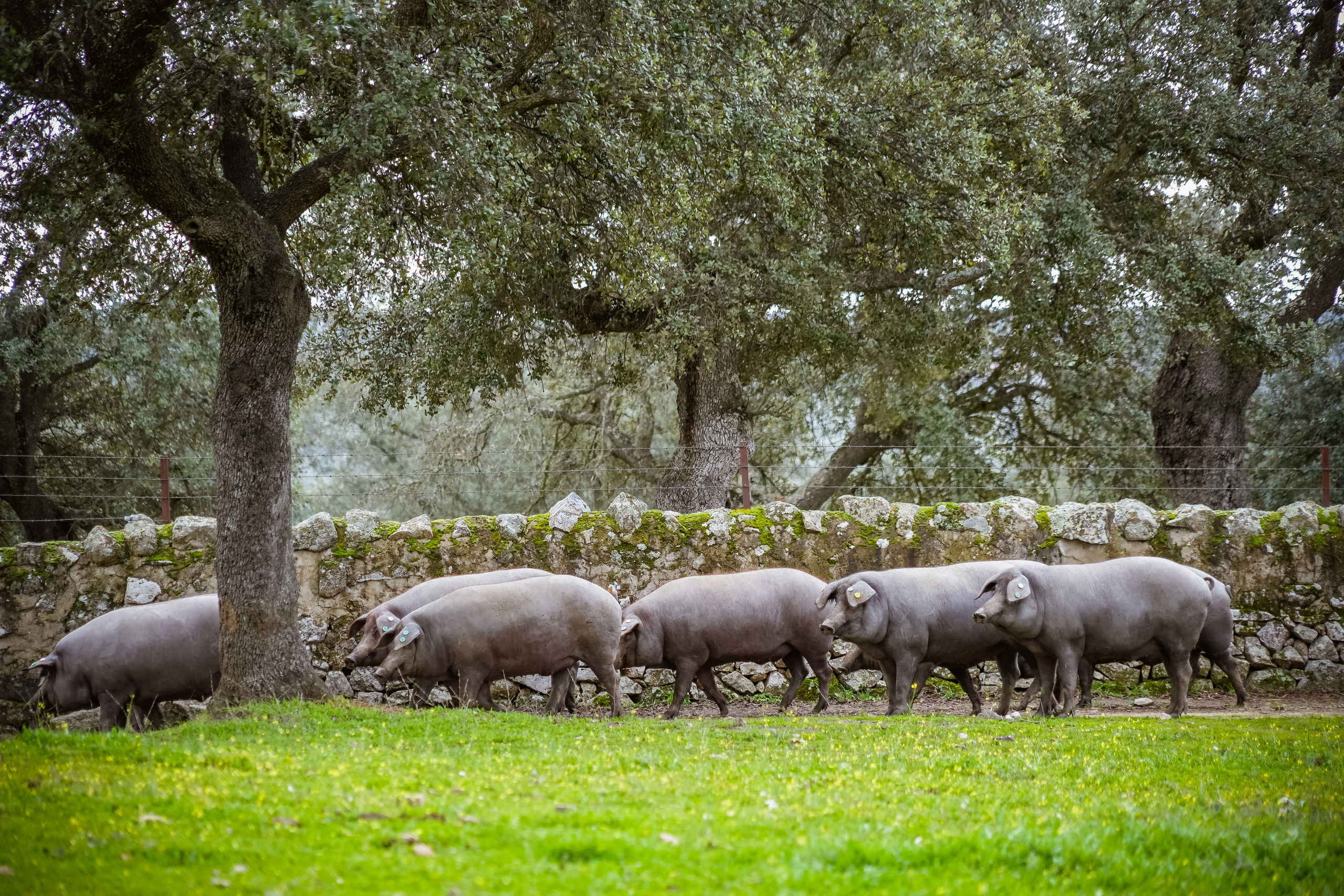 No sólo de buen alimento vive el cerdo de raza 100% ibérica, también hacen mucho ejercicio ya que recorren al día unos 10-12 kilómetros buscando bellotas.