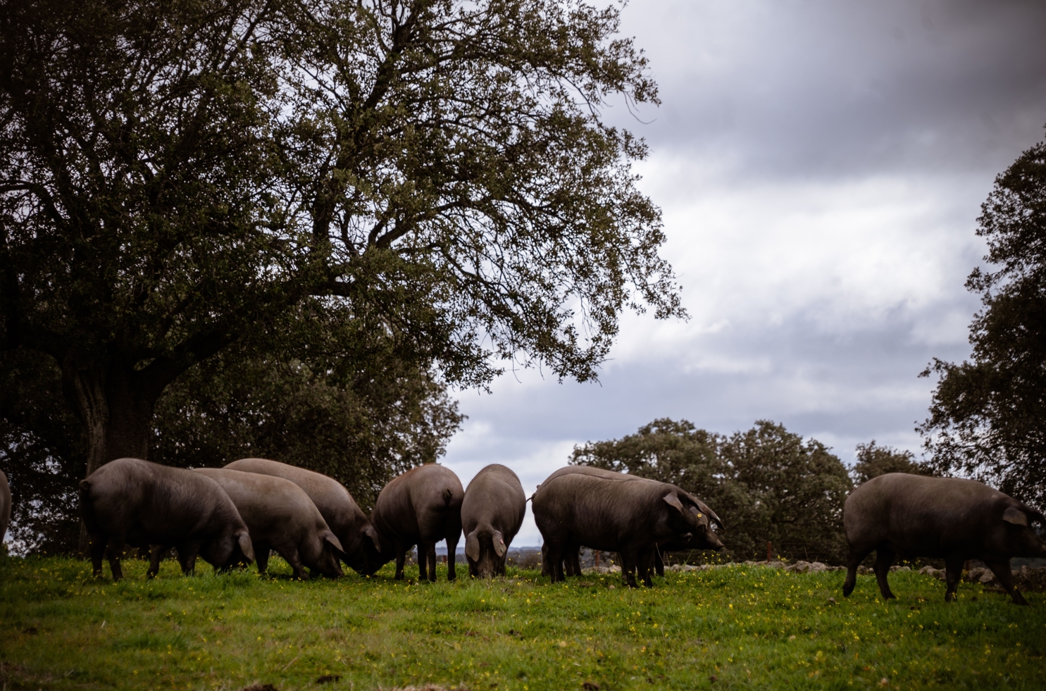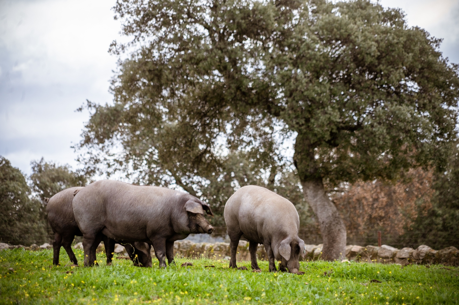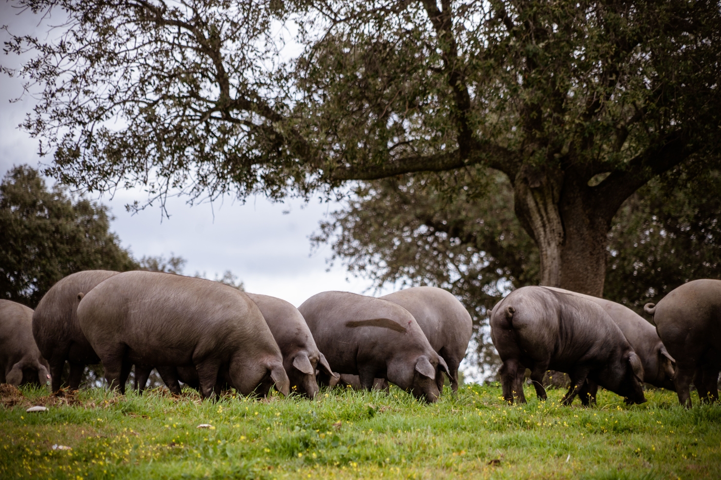 El cerdo debe engordar al menos 46 kg, come unos 12 kilos de bellotas y 5 de hierbas, plantas y raíces.