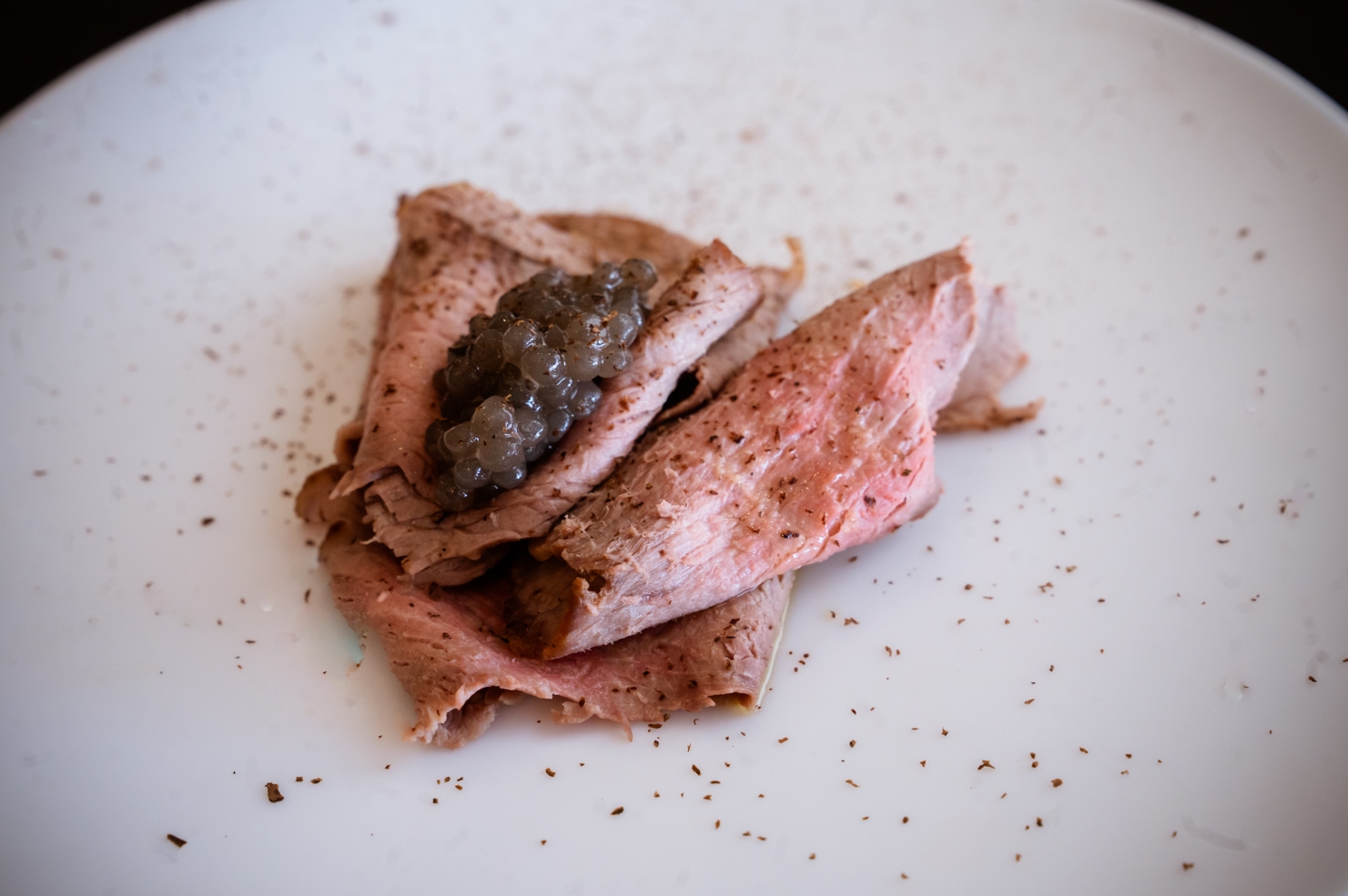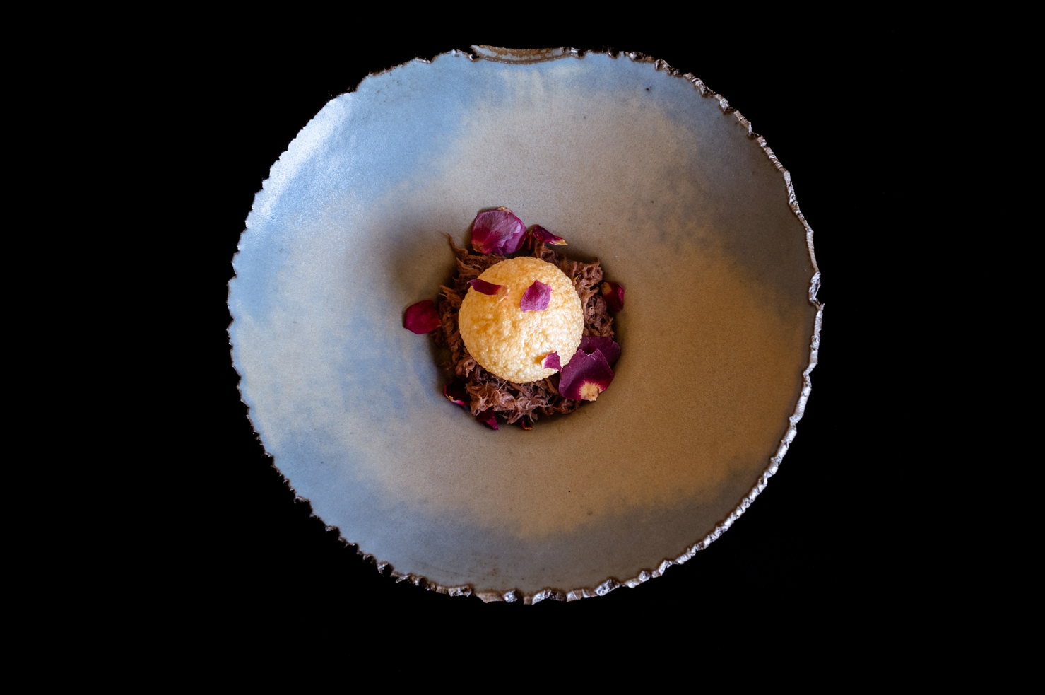 Carrillera de bellota 100% ibérica confitada con panipuri relleno de espuma de queso Gran Reserva COVAP.