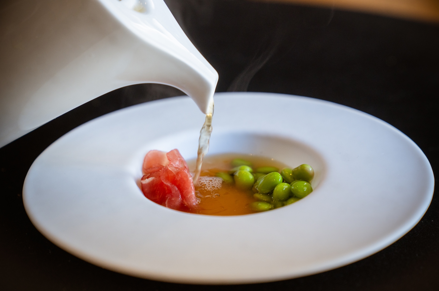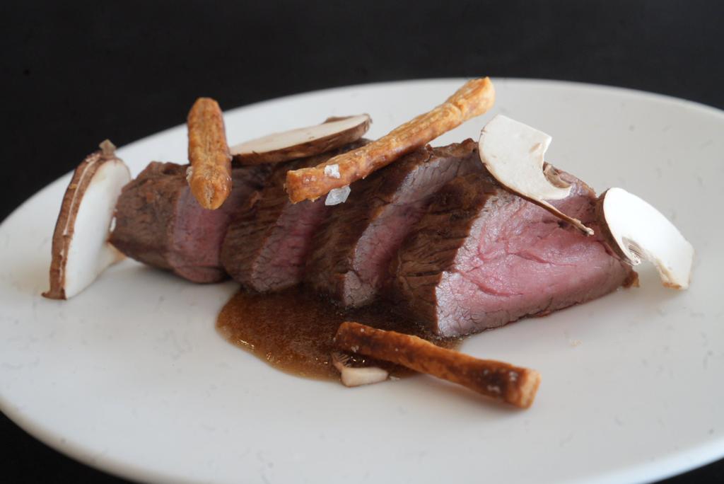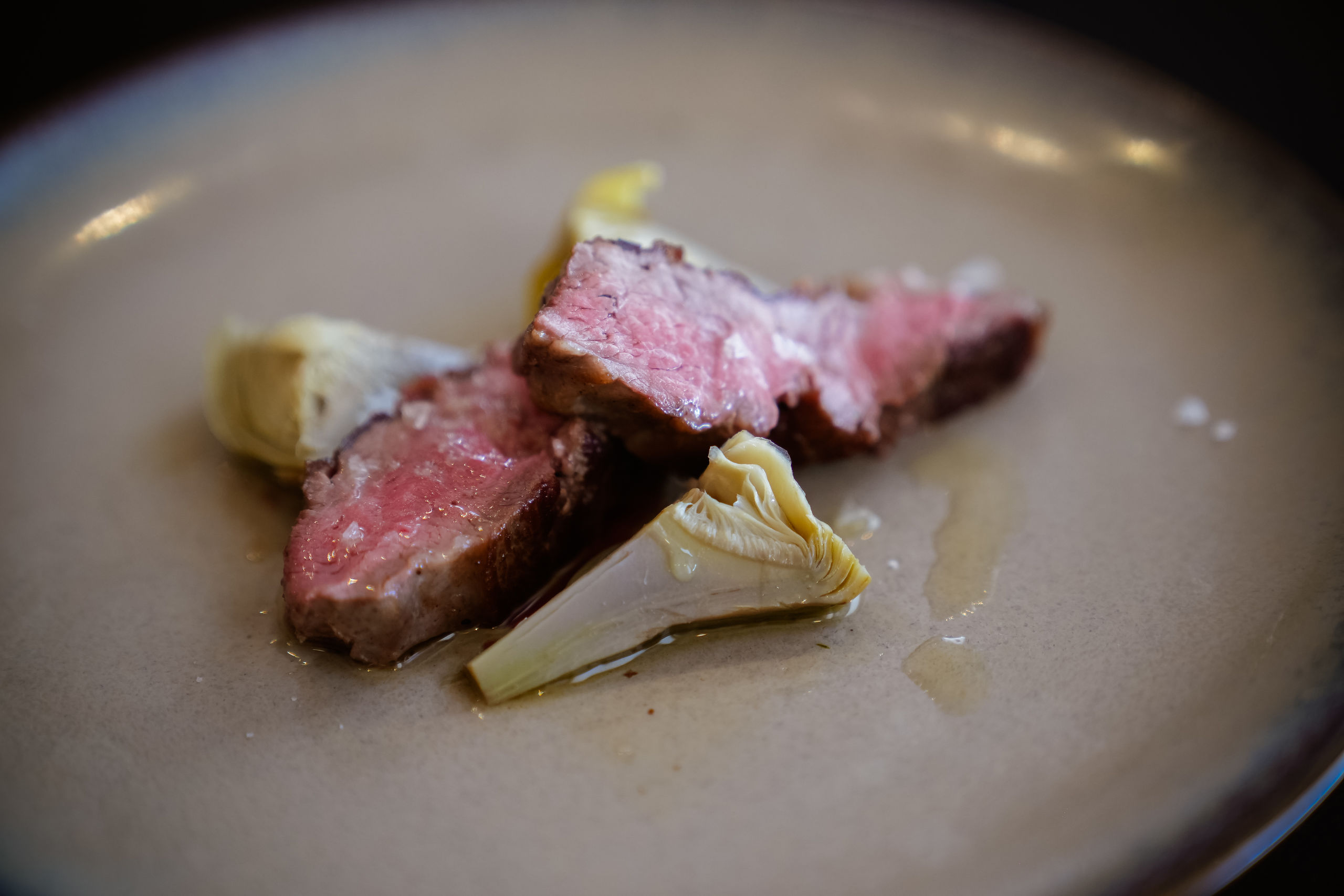 Pluma de bellota 100% ibérica con alcachofas, olivas negras y mantequilla de avellana.