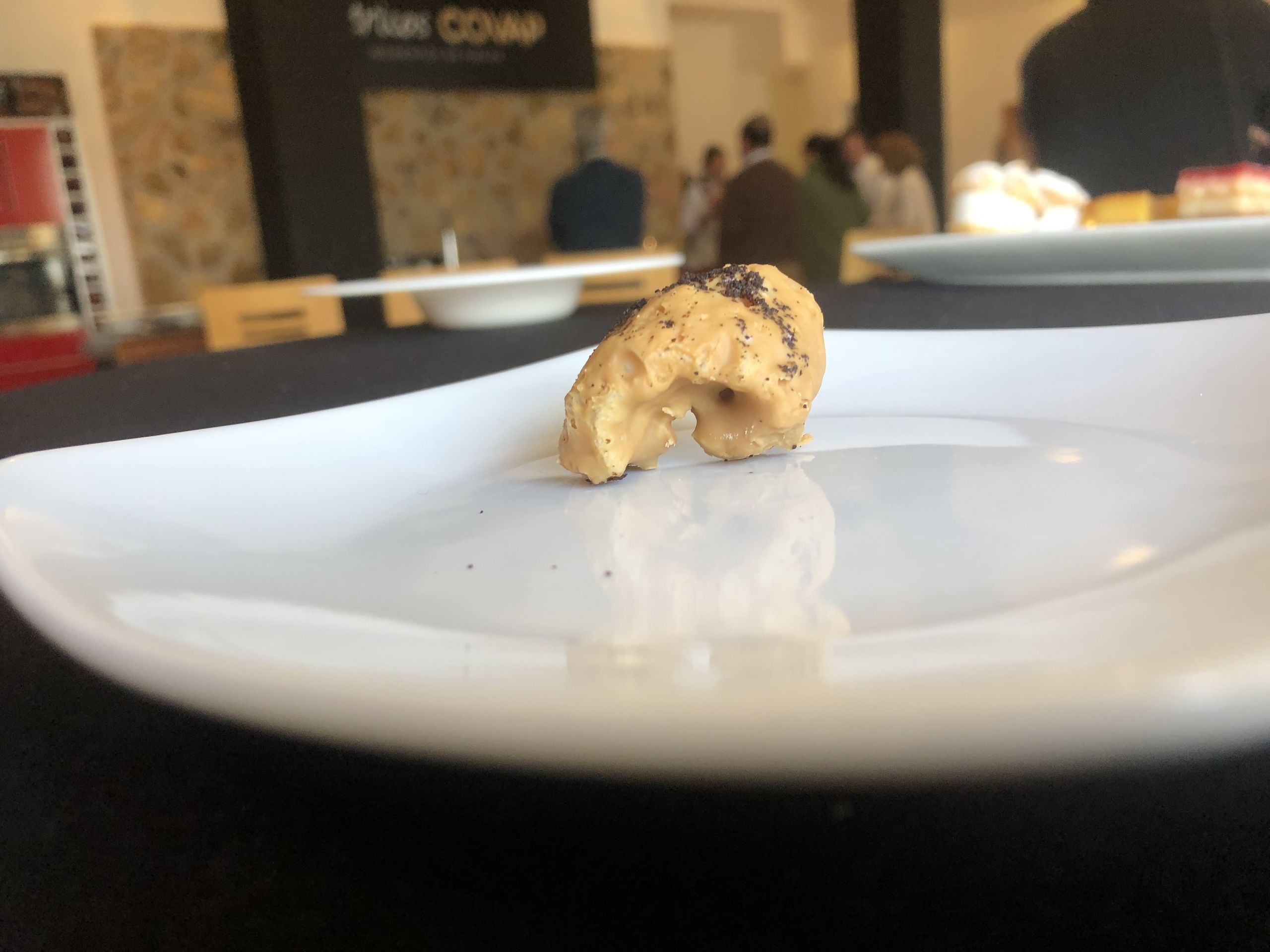 El postre elaborado por los chefs de torrezno recubierto de chocolate blanco.