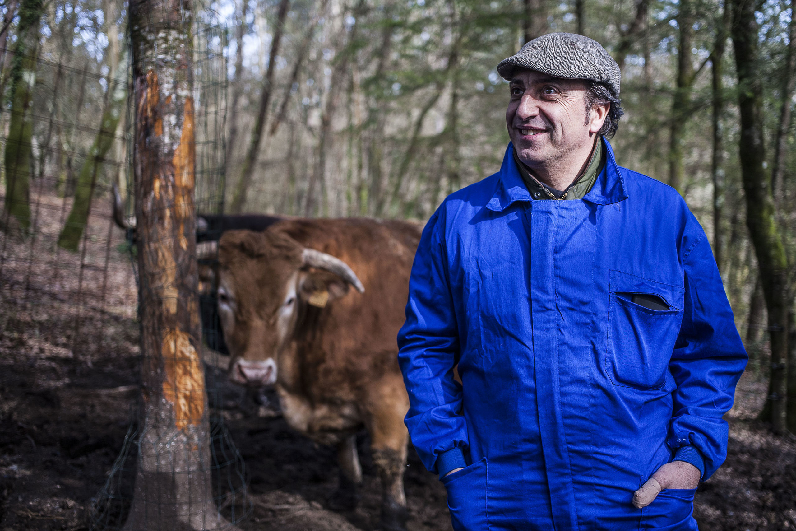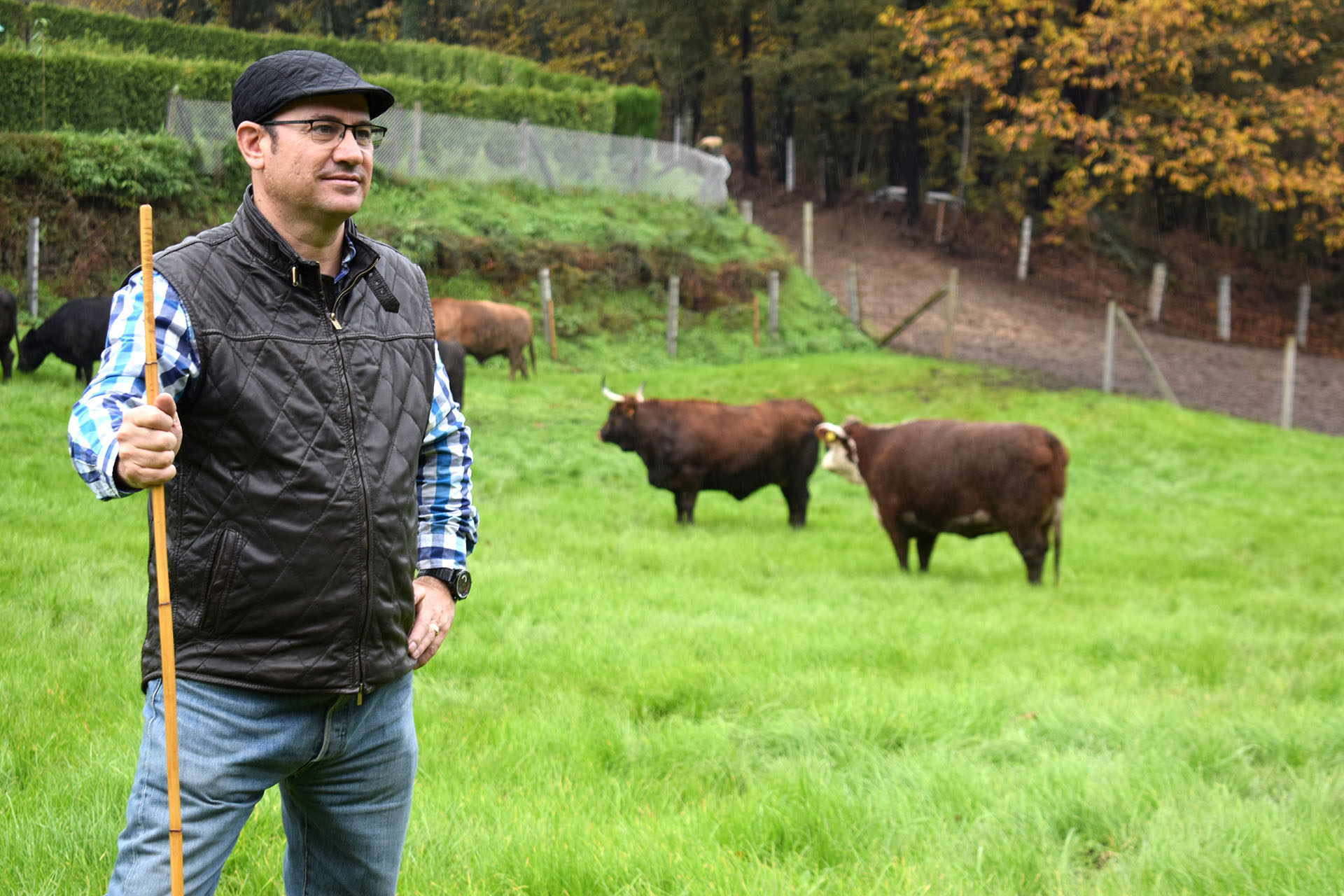 Carlos Ronda contempla los bueyes que pastan en libertad en una de las fincas de Fisterra Bovine World.