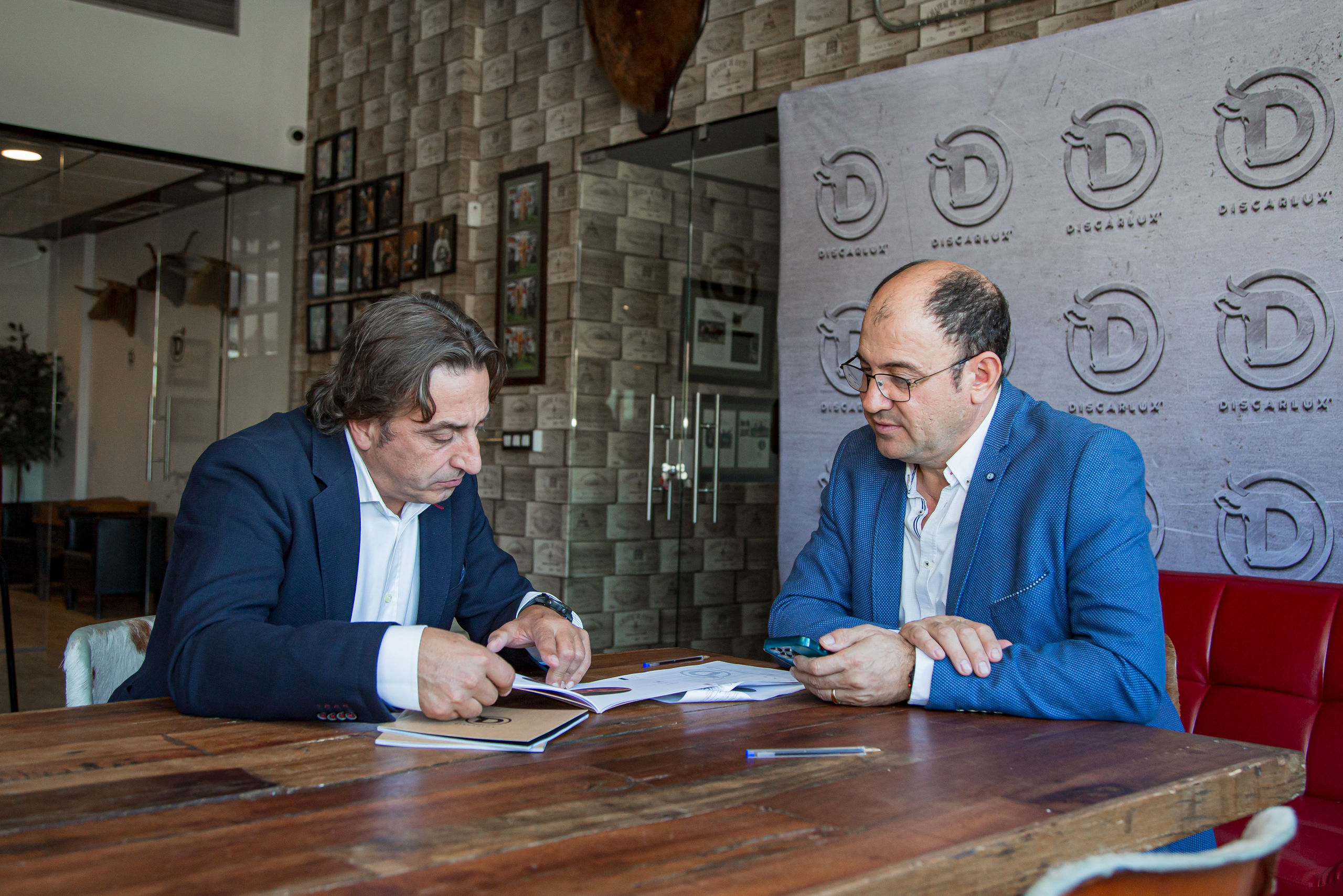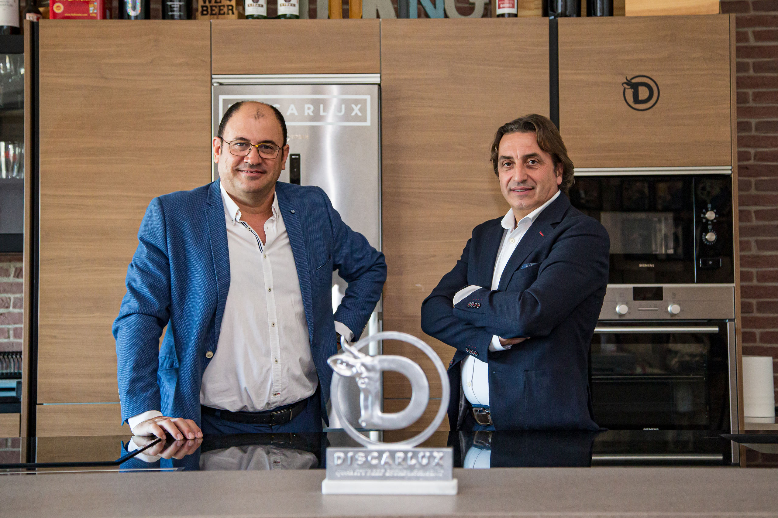 Carlos Ronda y Xosé Portas, los socios fundadores de Discarlux, posan en las instalaciones de la empresa ante el logo de Discarlux.
