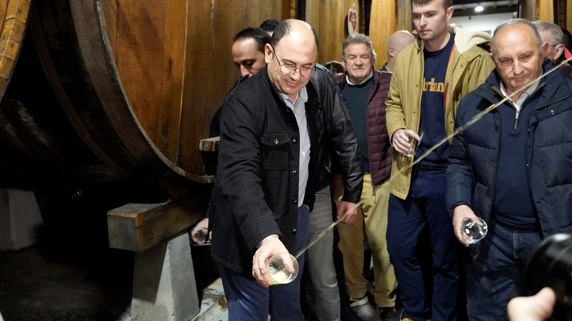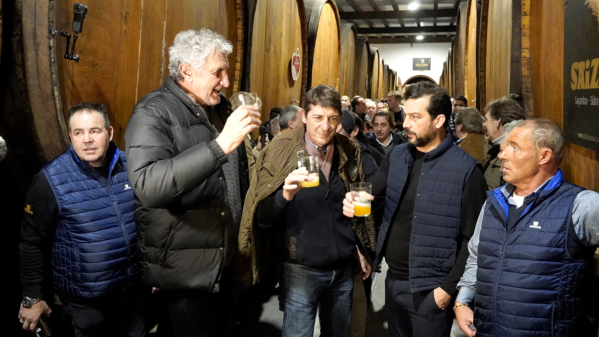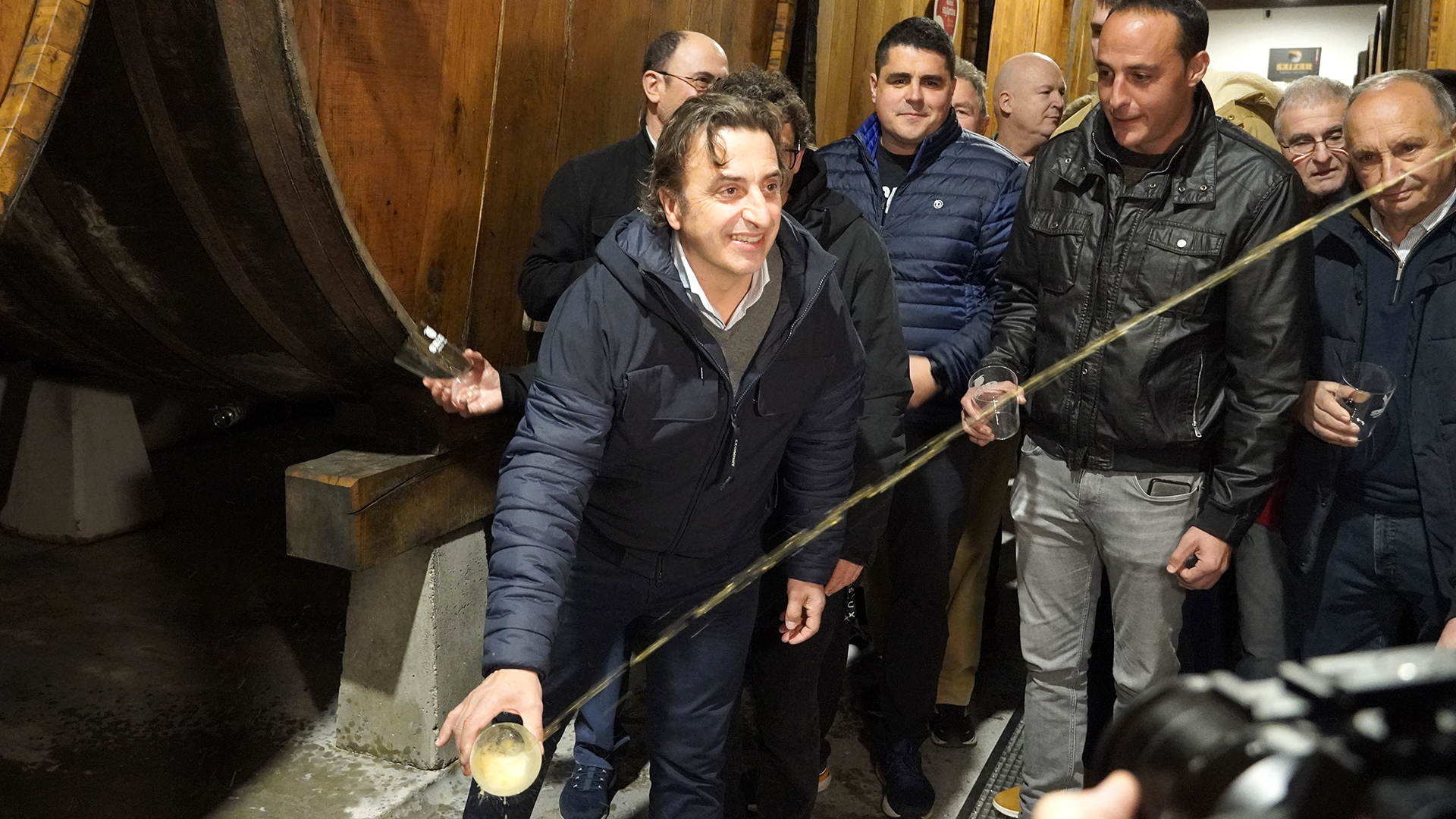 Carlos Ronda también disfruta del rito de escanciar la sidra directamente del barril en la apertura del txotx 2023.