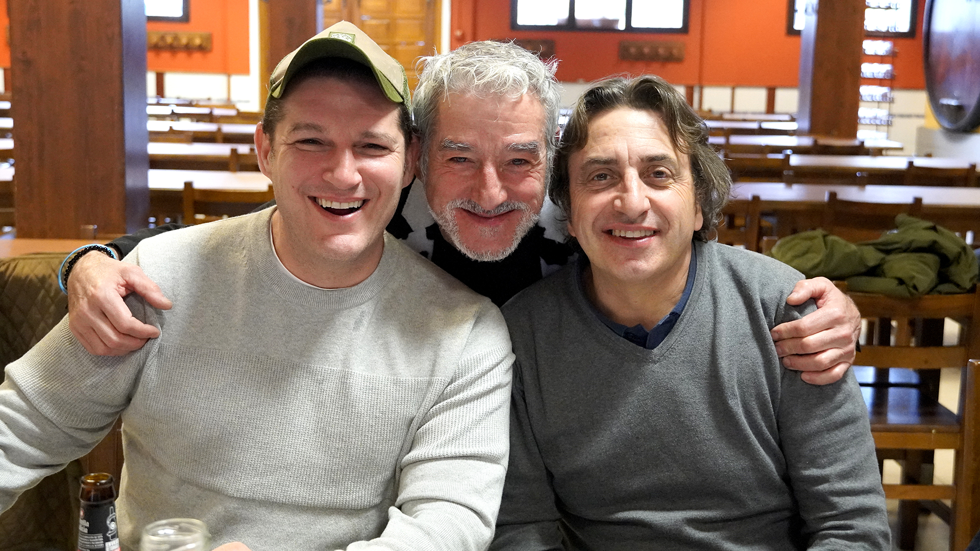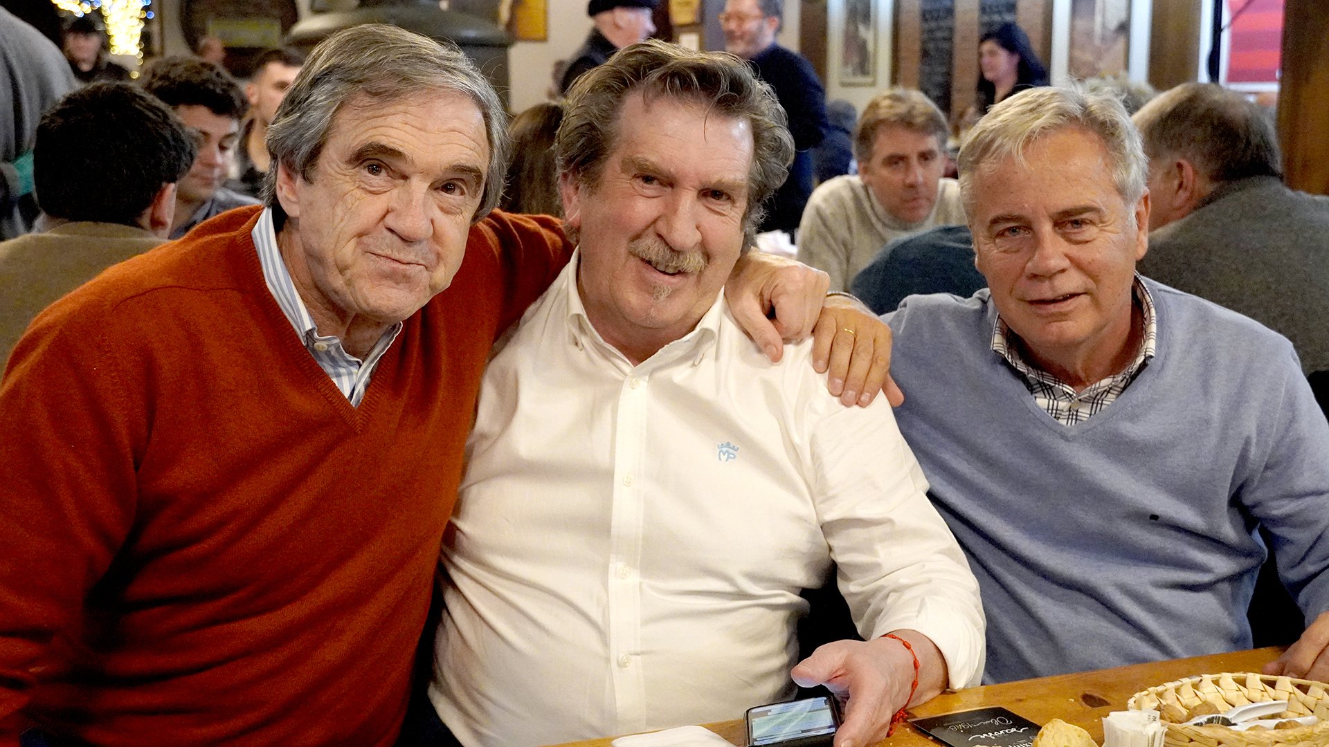 Los exfutbolistas de la Real Sociedad, Arconada y López Ufarte, flanquean al periodista Iñaki Cano, en la apertura del txotx.