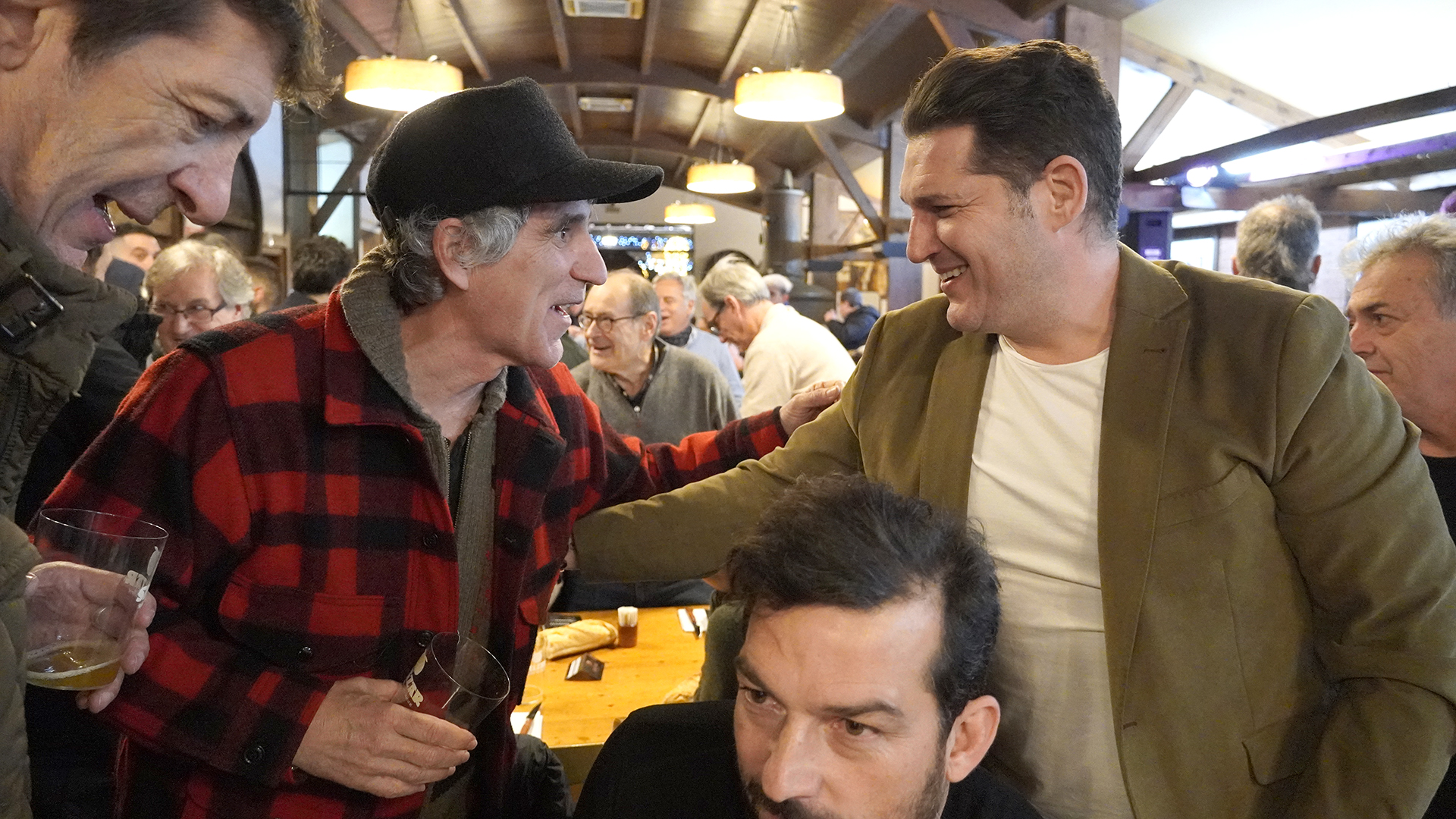 Los cantantes Mikel Erentxun y Manu Tenorio se saludan en la apertura del txotx.