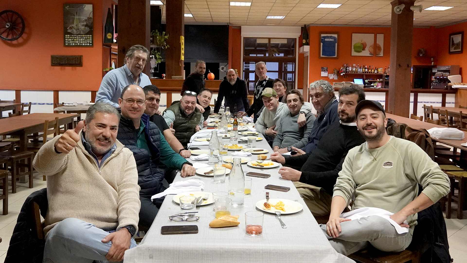 Y parte de los amigos de Discarluz y de La Cofradía del Txuletón tras disfrutar de la comida y bebida por la IX Apertura del Txotx en la Sidrería Saizar.