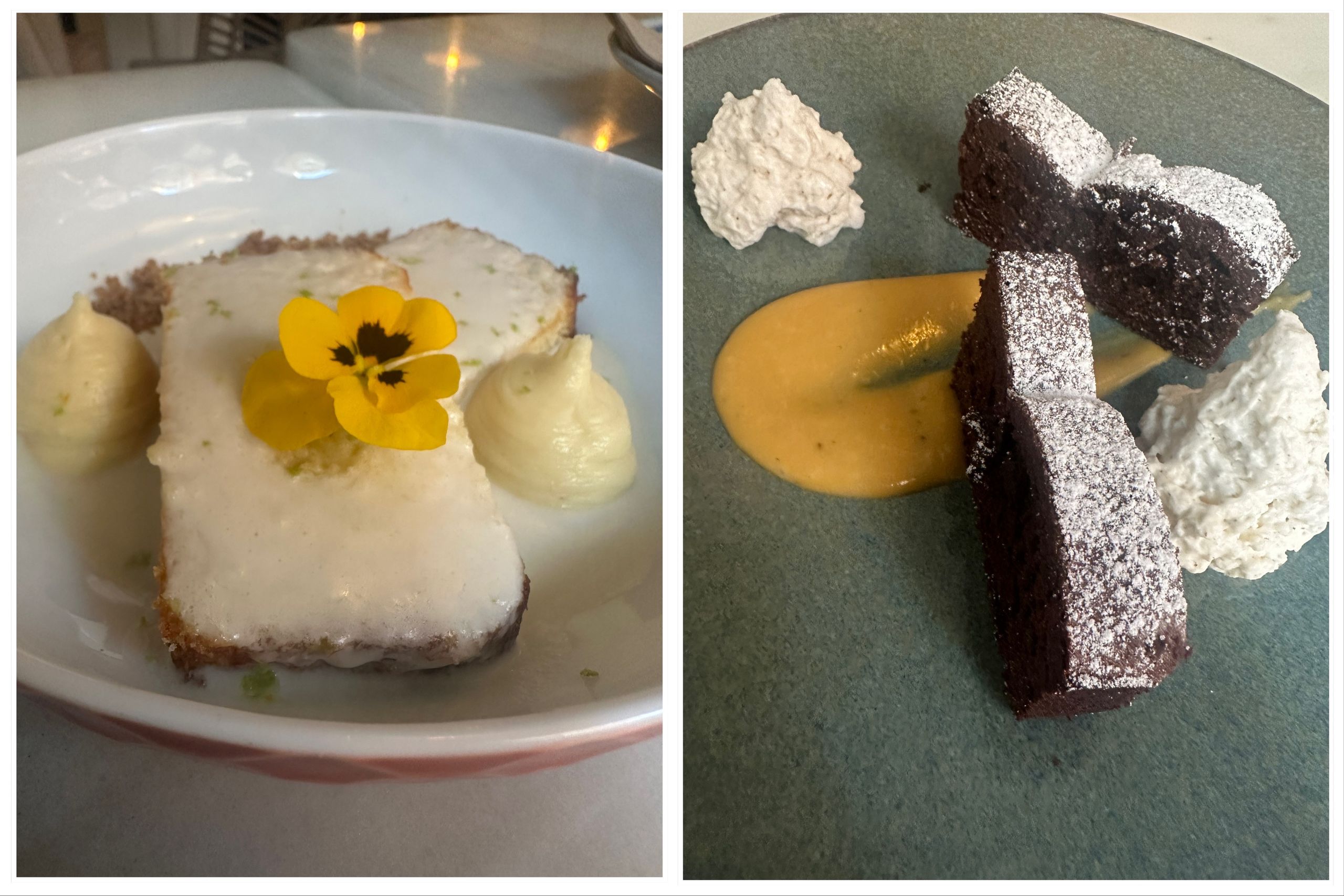 Y de postre un delicioso bizcocho de limón, leche de hierbabuena y emulsión de brioche (8€) y otro muy rico brownie de algarroba, emulsión de calabaza y espuma de shiitake (8€).