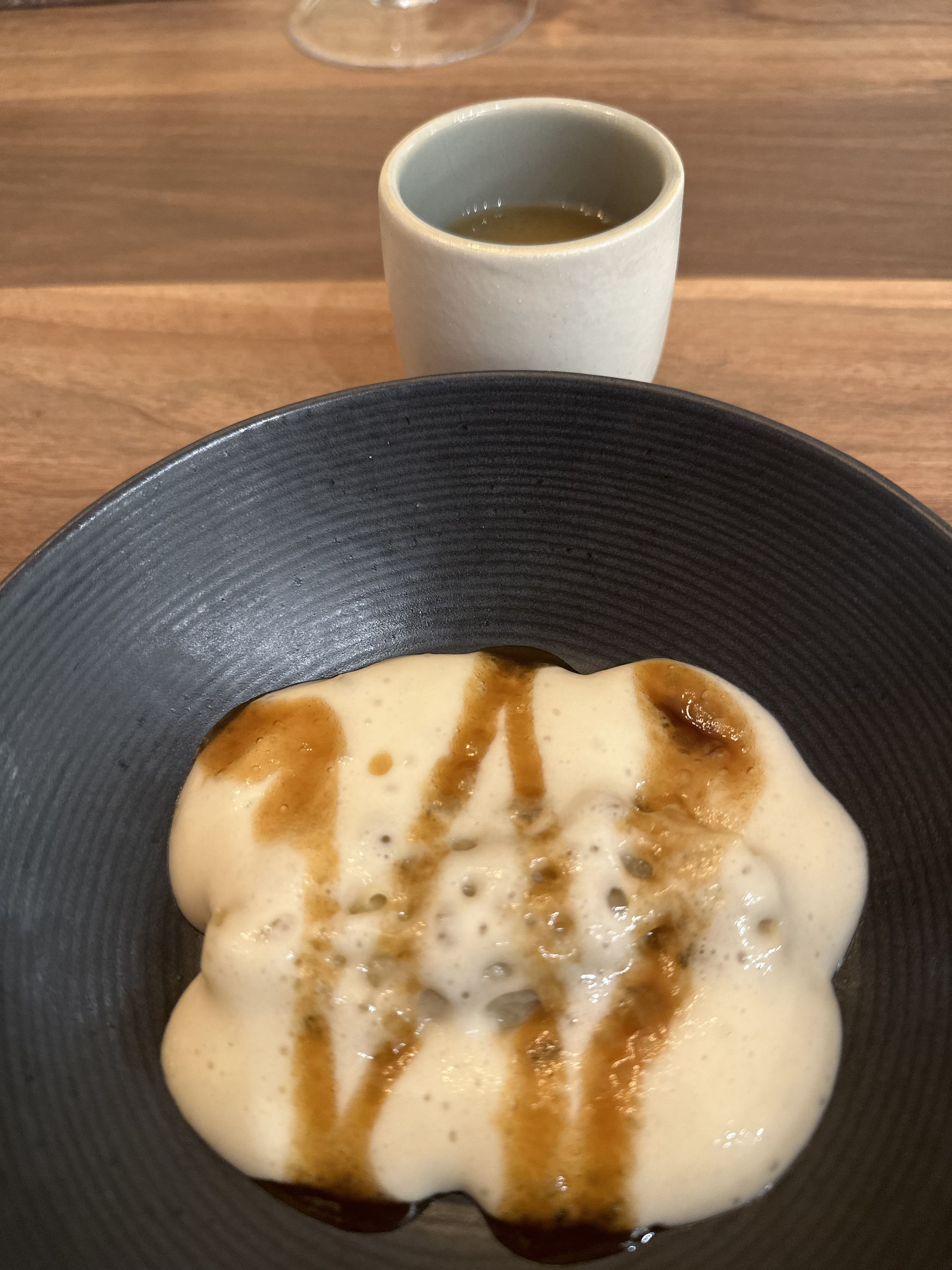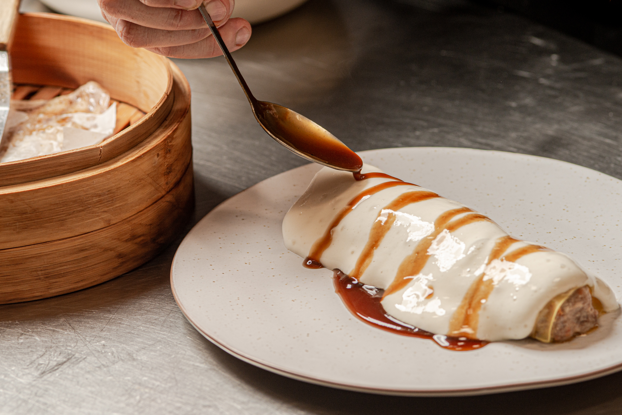Espectacular canelón de cocido, que lo hacen con las carnes del cocido que sirven para rellenar la pasta wantán, que es más fina que la del canelón, y se termina con una velouté del caldo y una reducción del caldo de los huesos