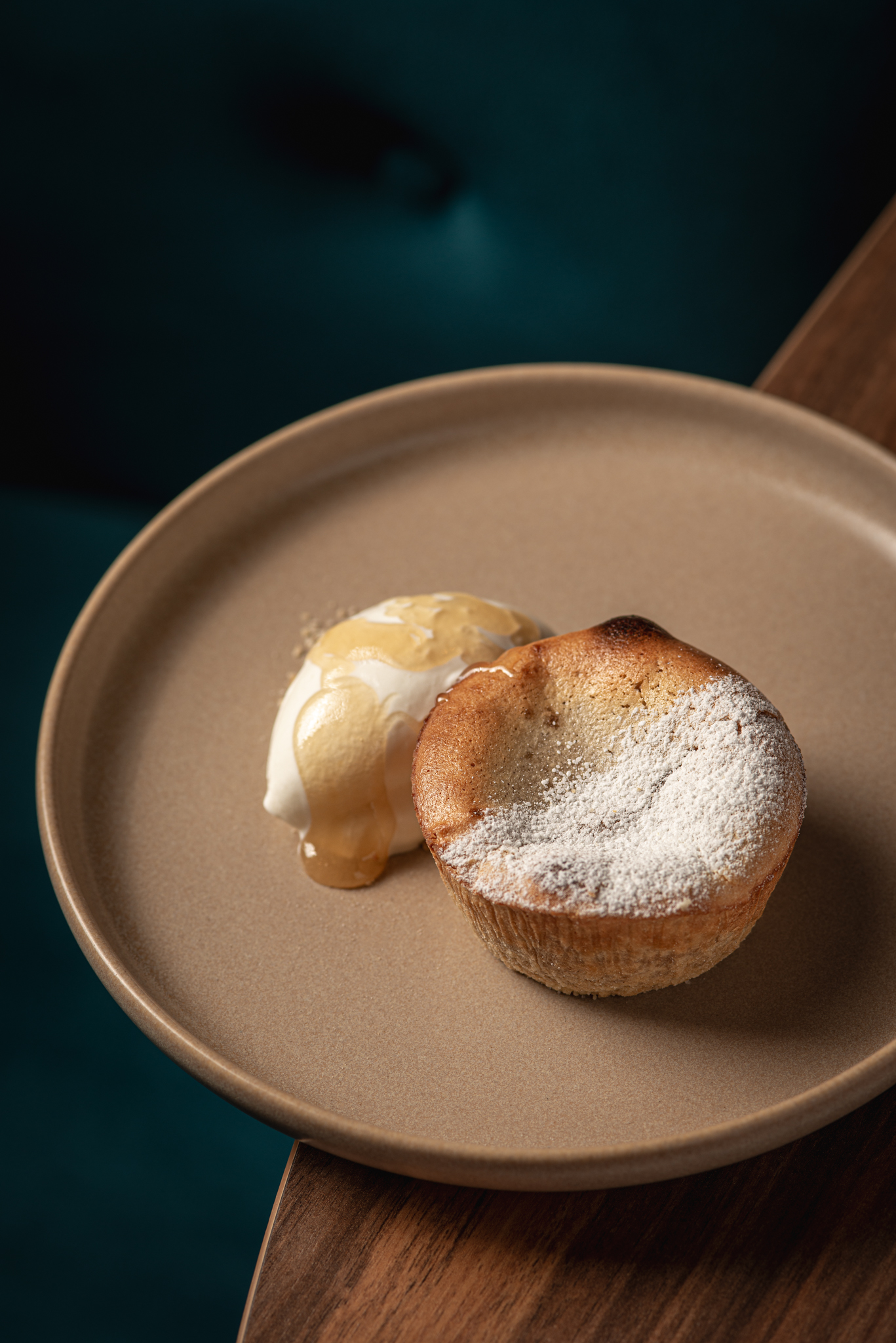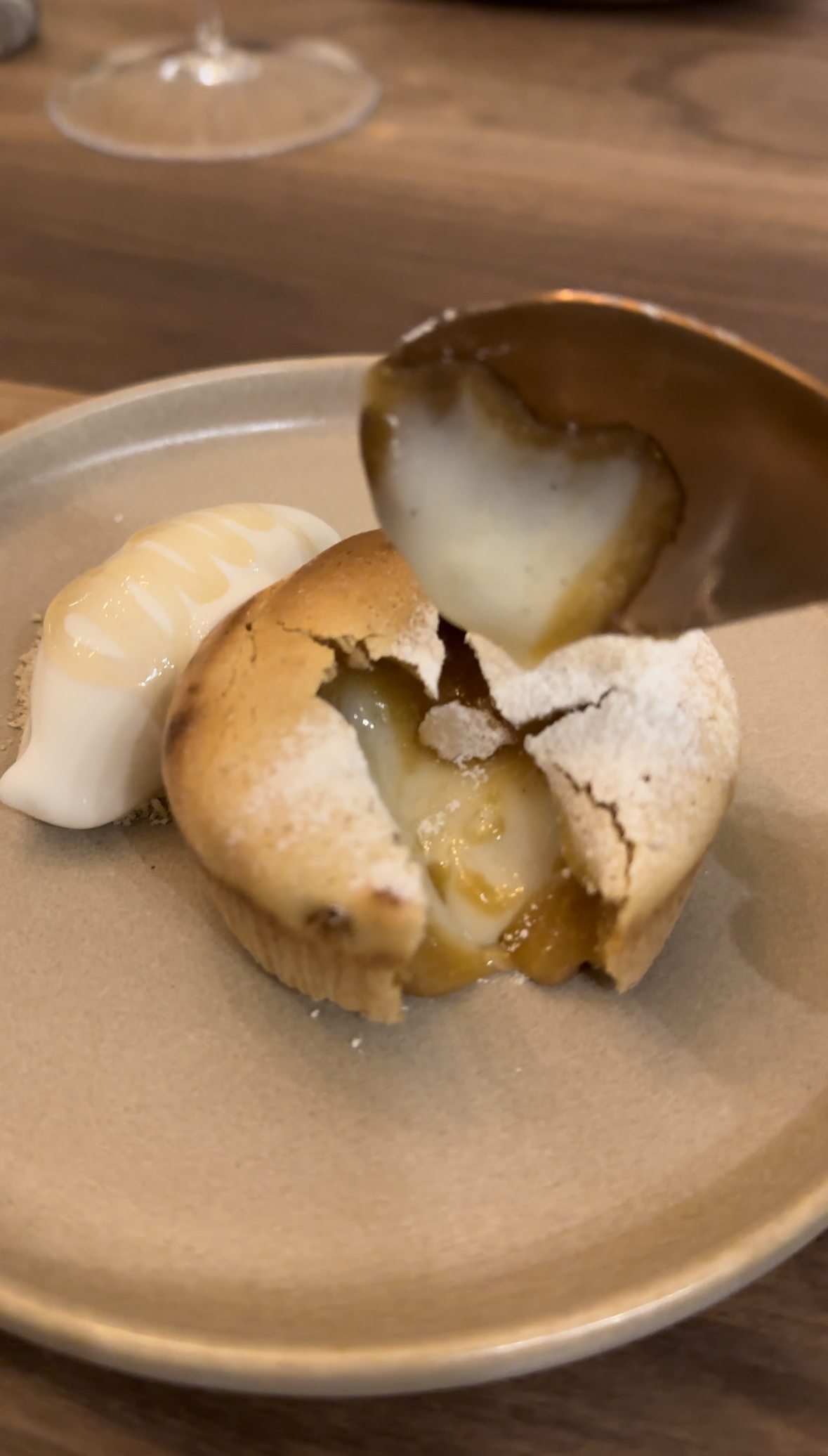 La tarta líquida de Santiago y helado de yogur una vez abierta en la que se comprueba la deliciosa crema de su interior.