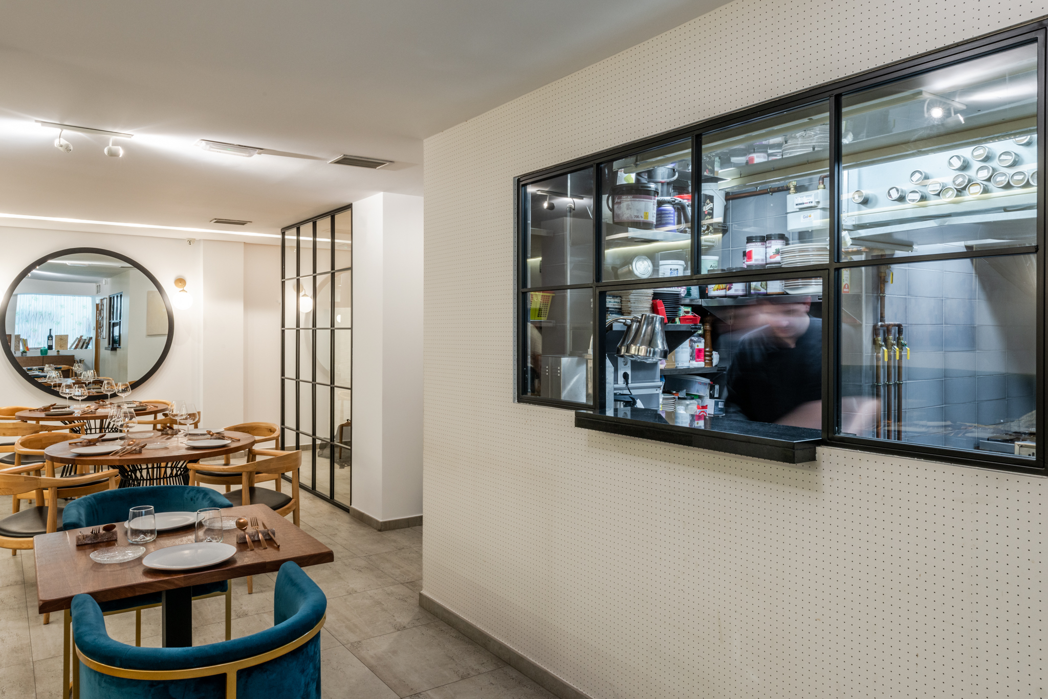 En el pasillo que da acceso al salón comedor también hay mesas altas para disfrutar de la cocina de Eduardo Guerrero.