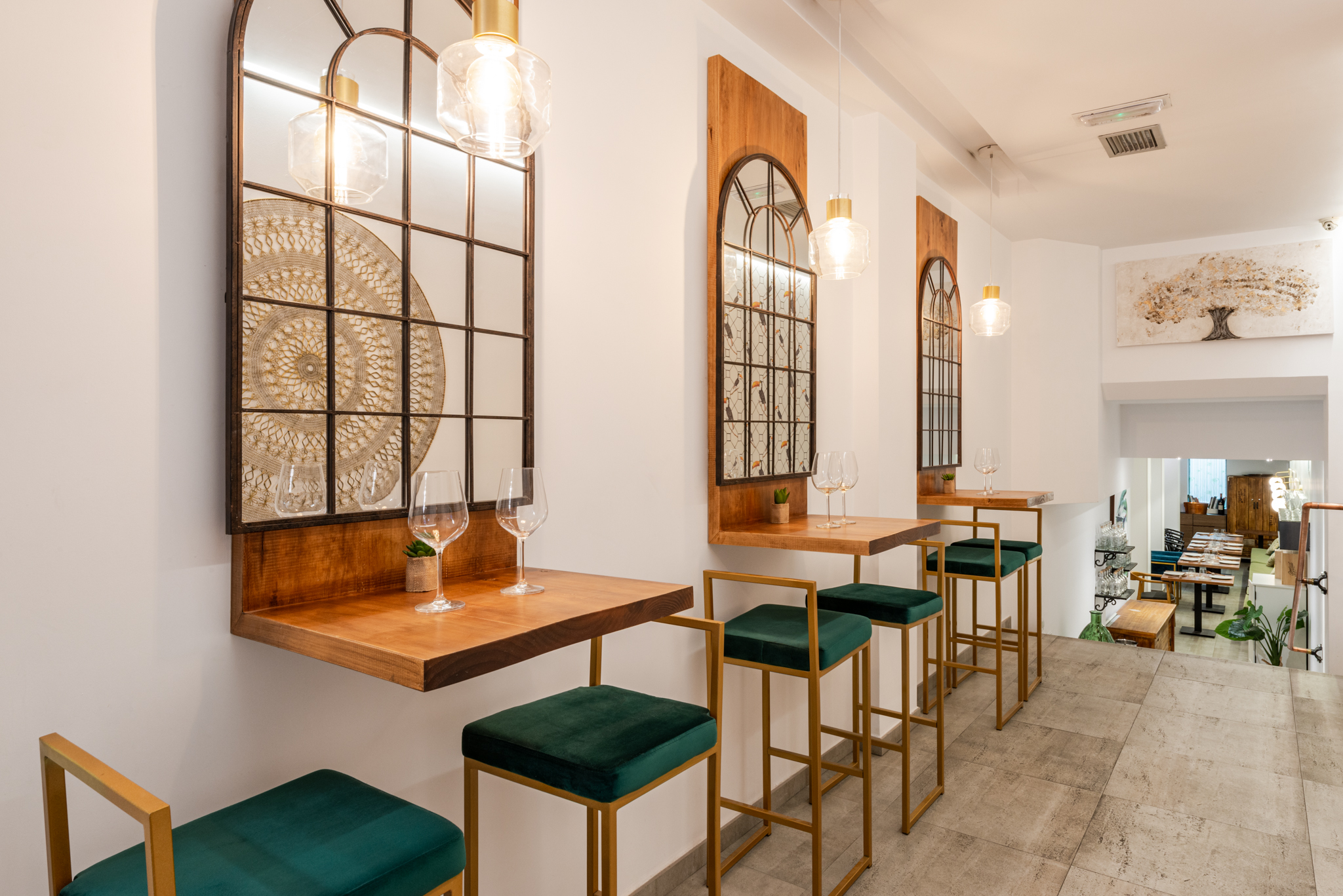En la entrada de Adaly te puedes encontrar mesas altas para que puedas disfrutar de esta gastronomía tan especial.