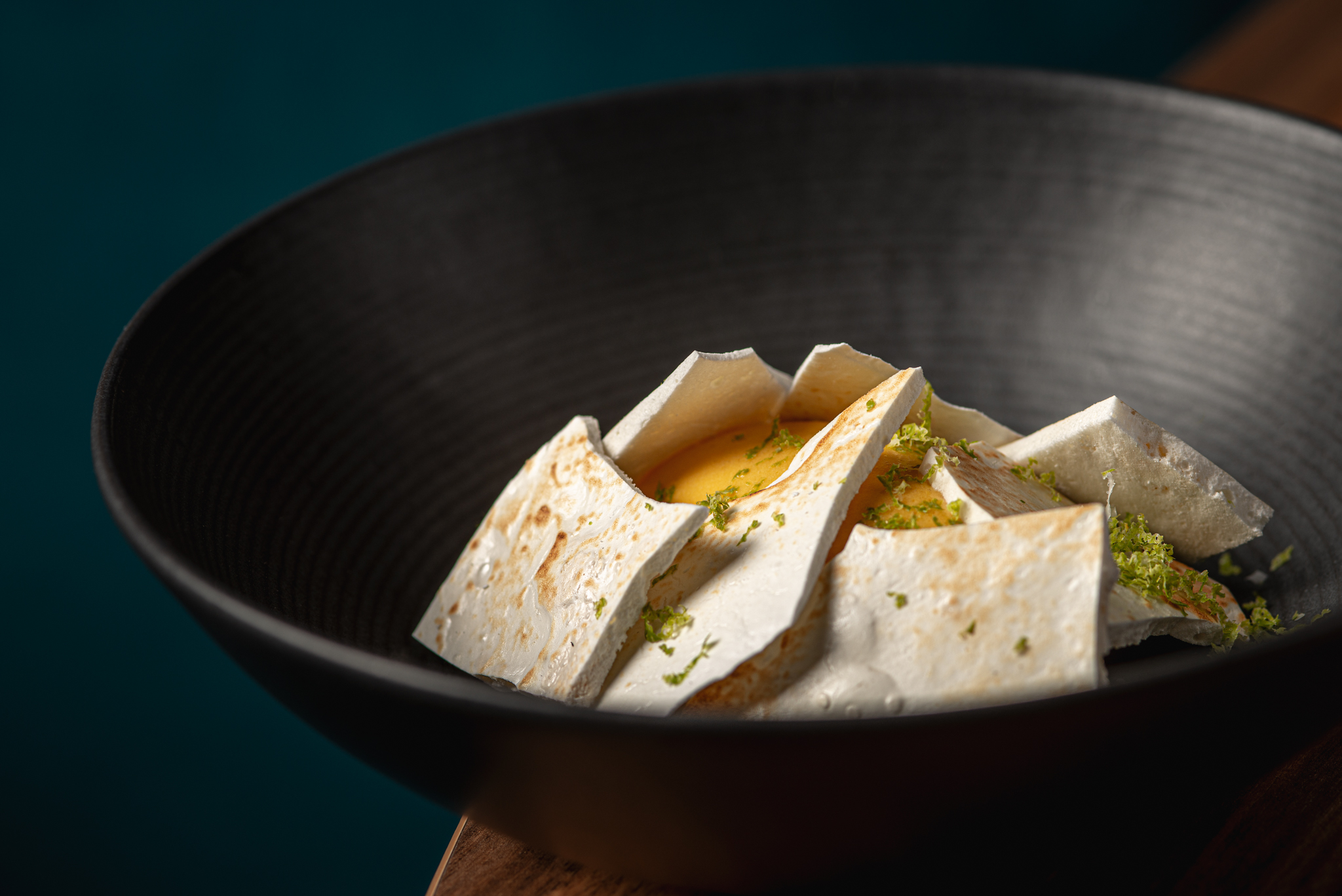 Sorbete de mango sobre crema de maracuyá, chocolate blanco y lima.