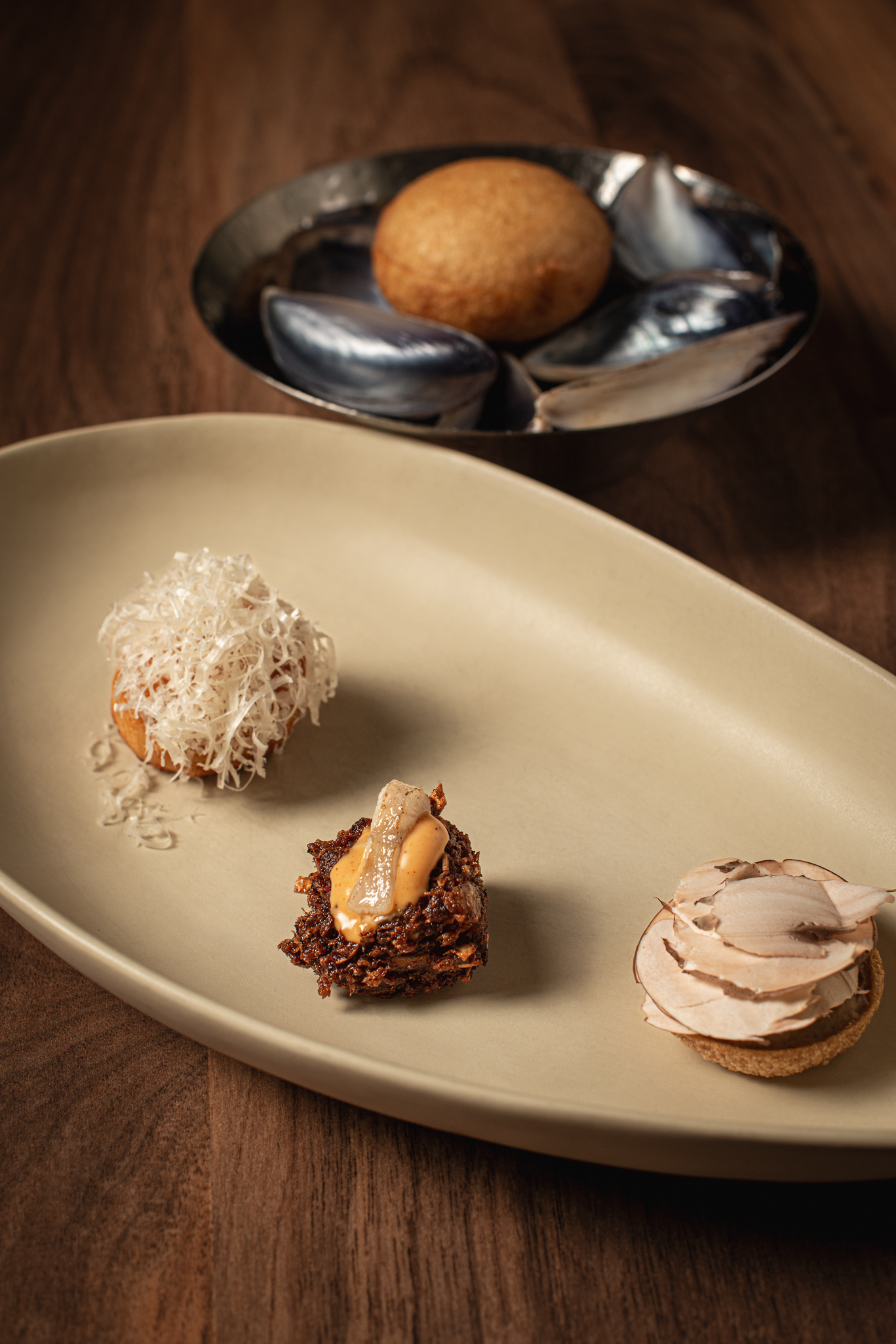 Panipuri de boletus, crujiente de oreja de cerdo y mayonesa de kimchi, buñuelo de queso manchego y, al fondo, pan chino relleno de crema de mejillones.