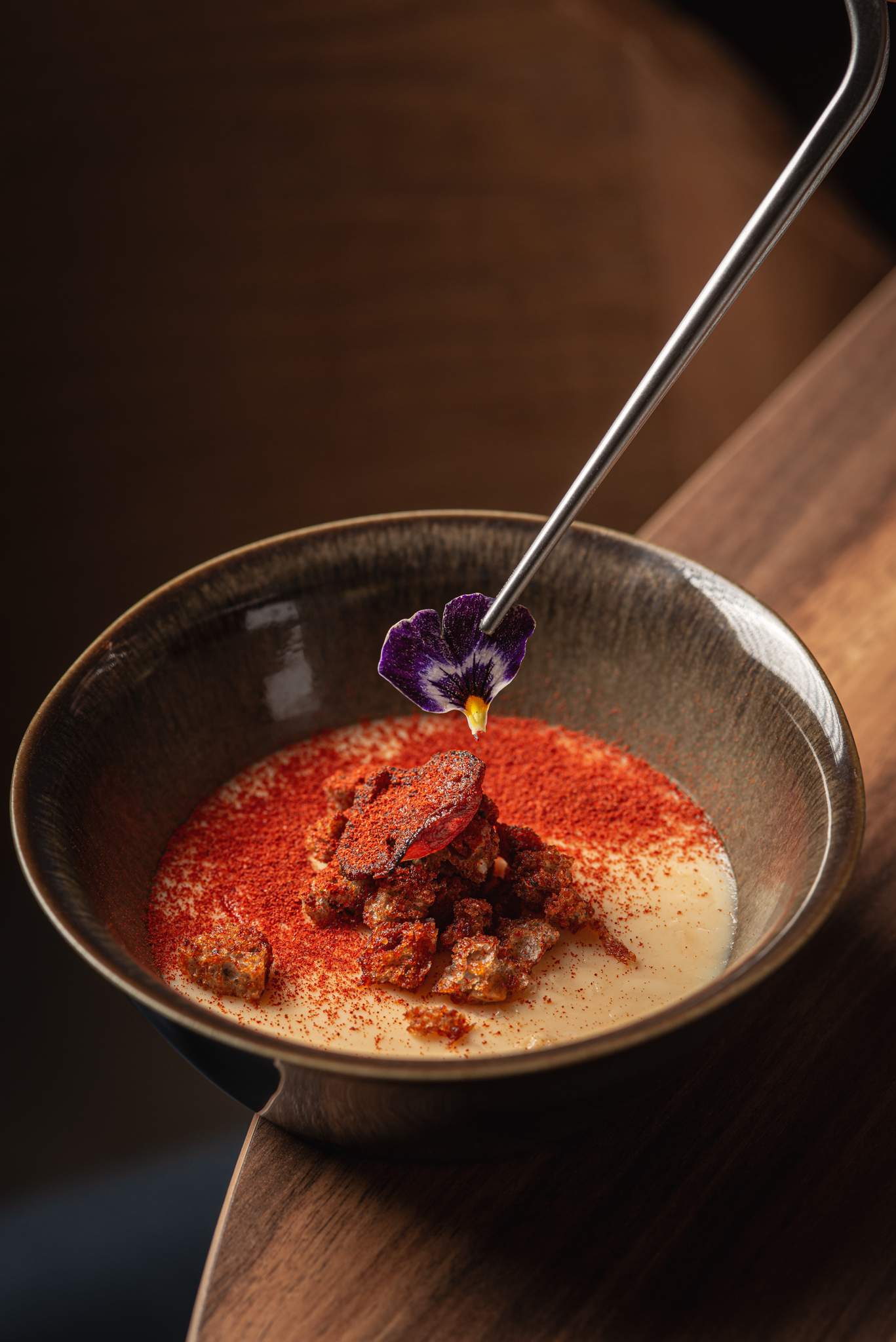Chawanmushi, un flan salado estilo japonés con un ligero toque de ajo y pimentón, acompañado con picatostes y una rodaja de chorizo frito