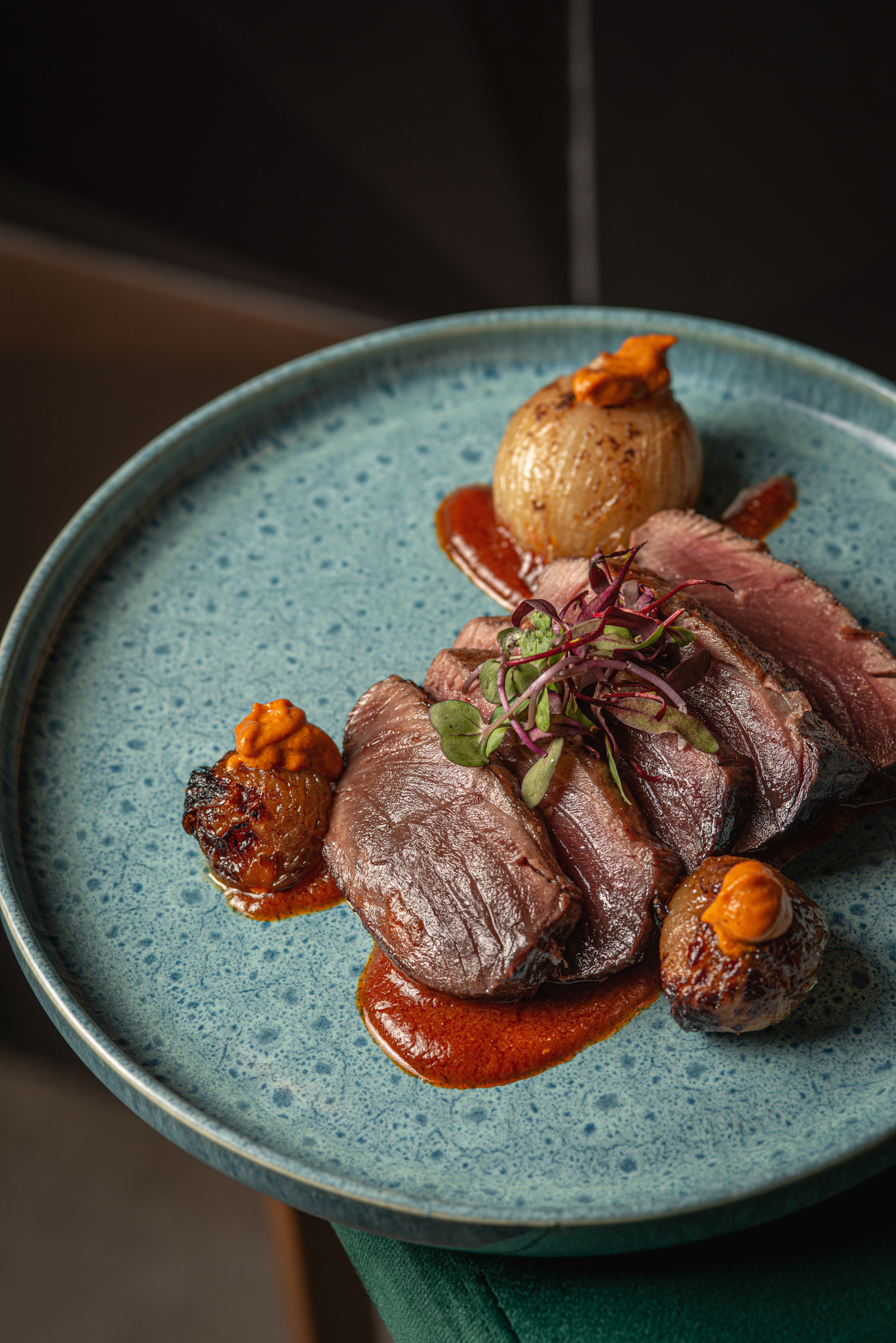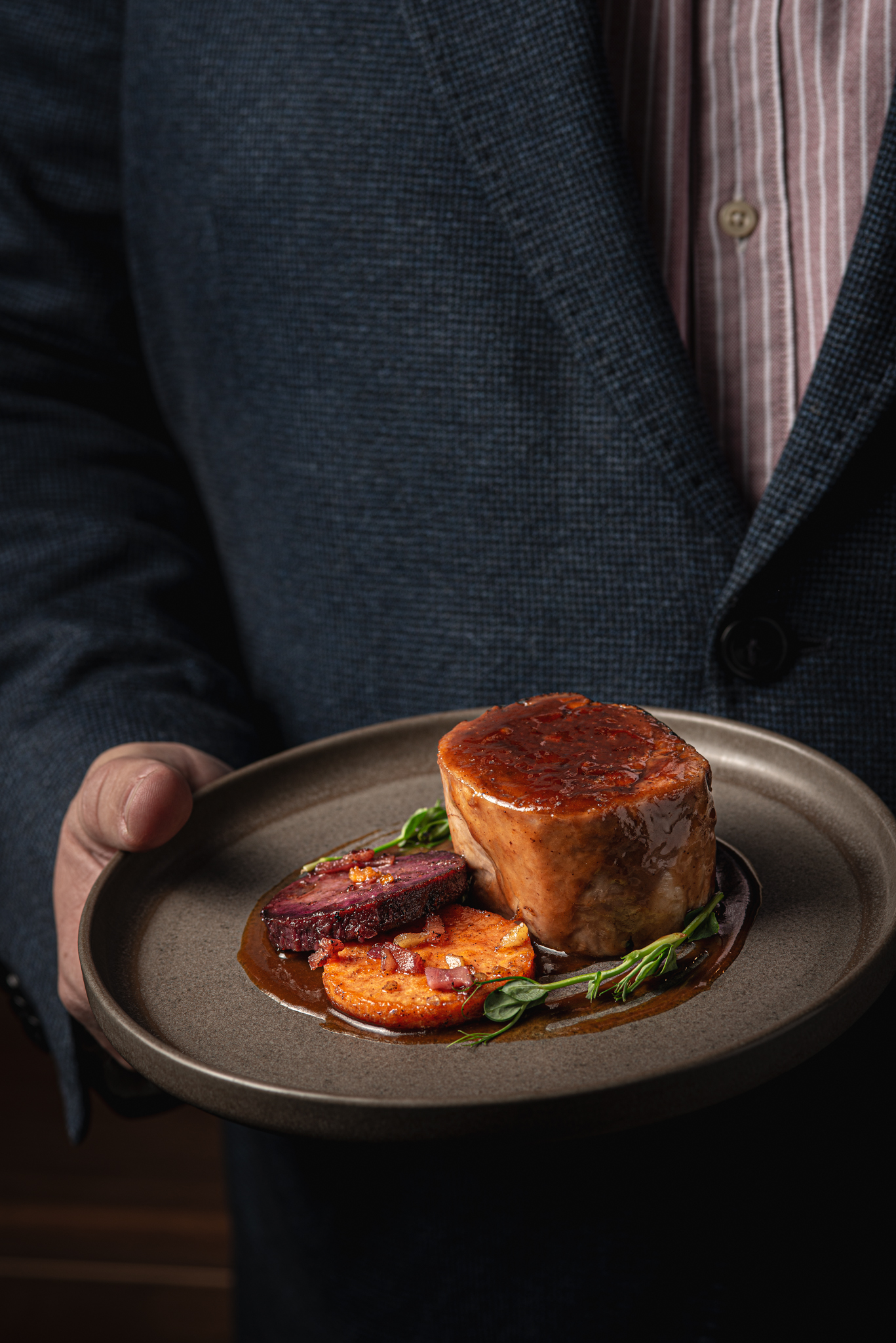 Cordero cocinado 19 horas a baja temperatura, se termina en sartén con mantequilla negra, se sirve con jengibre caramelizado y alcaparras y se acompaña con boniato glaseado.