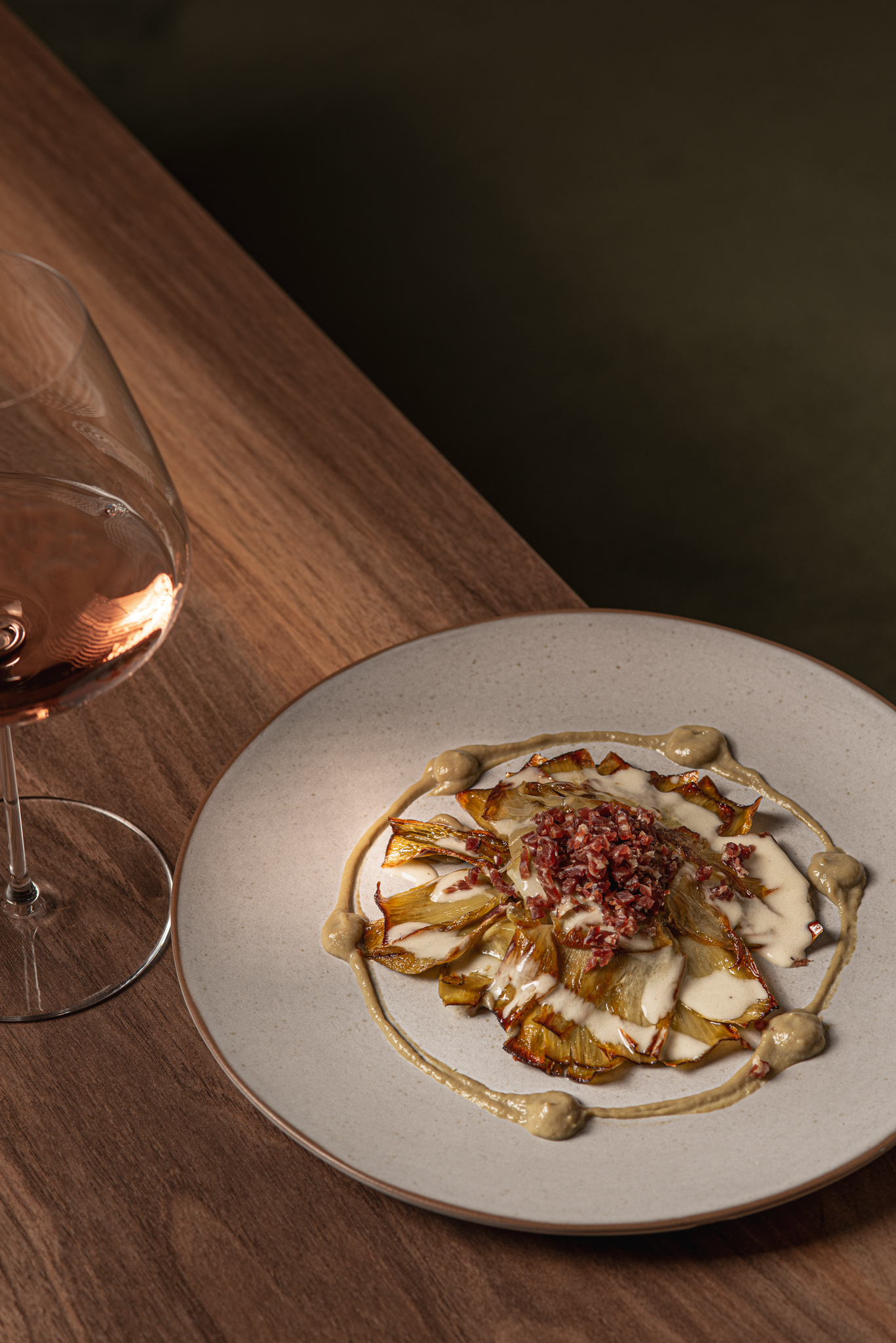 Alcachofa con tartar de jamón ibérico, salsa de alcachofa y de escabeche de manzanilla.