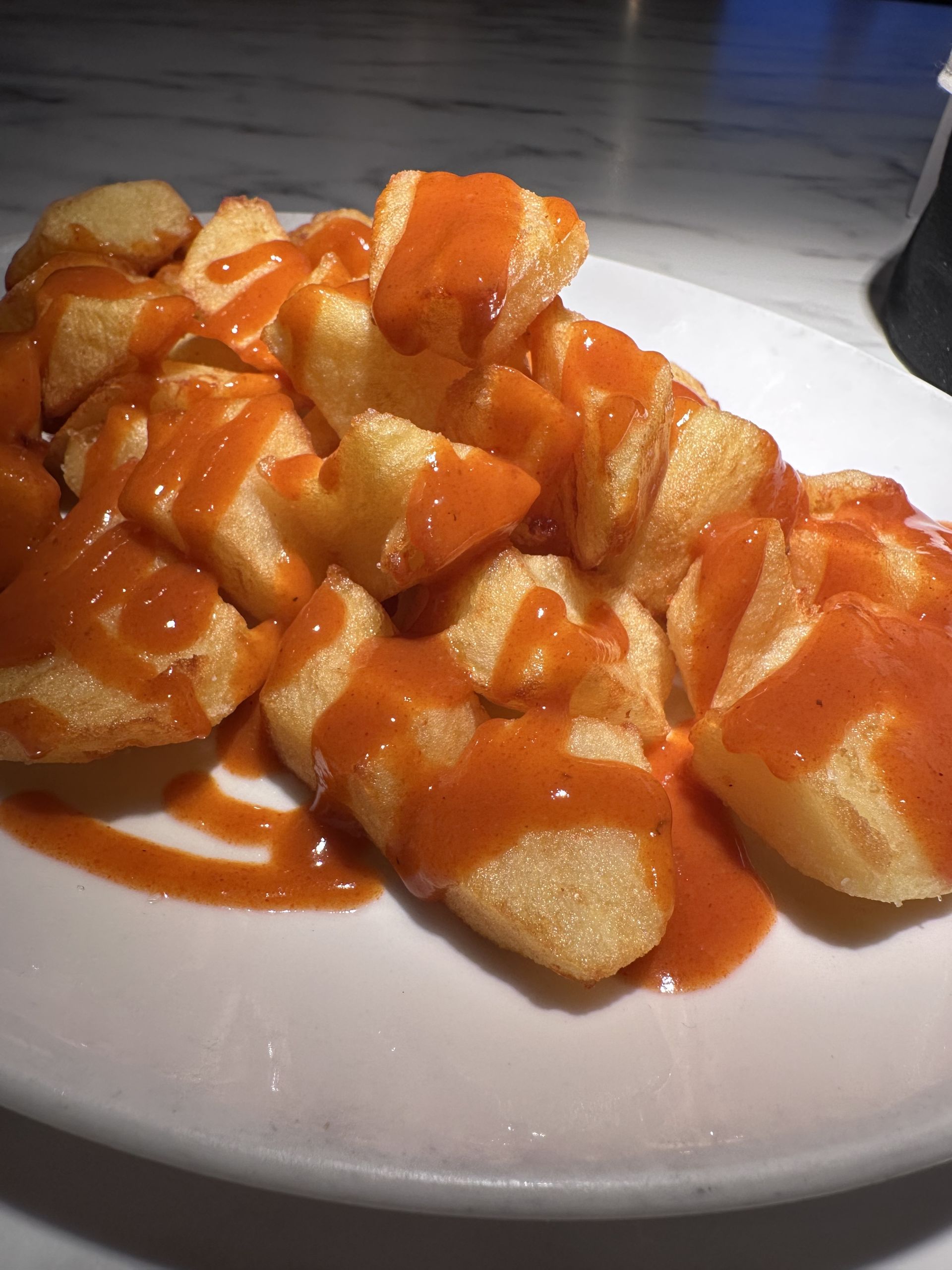 La bravas de Bareto con su caña, servidas en la terraza con sus vistas a la Cibeles.