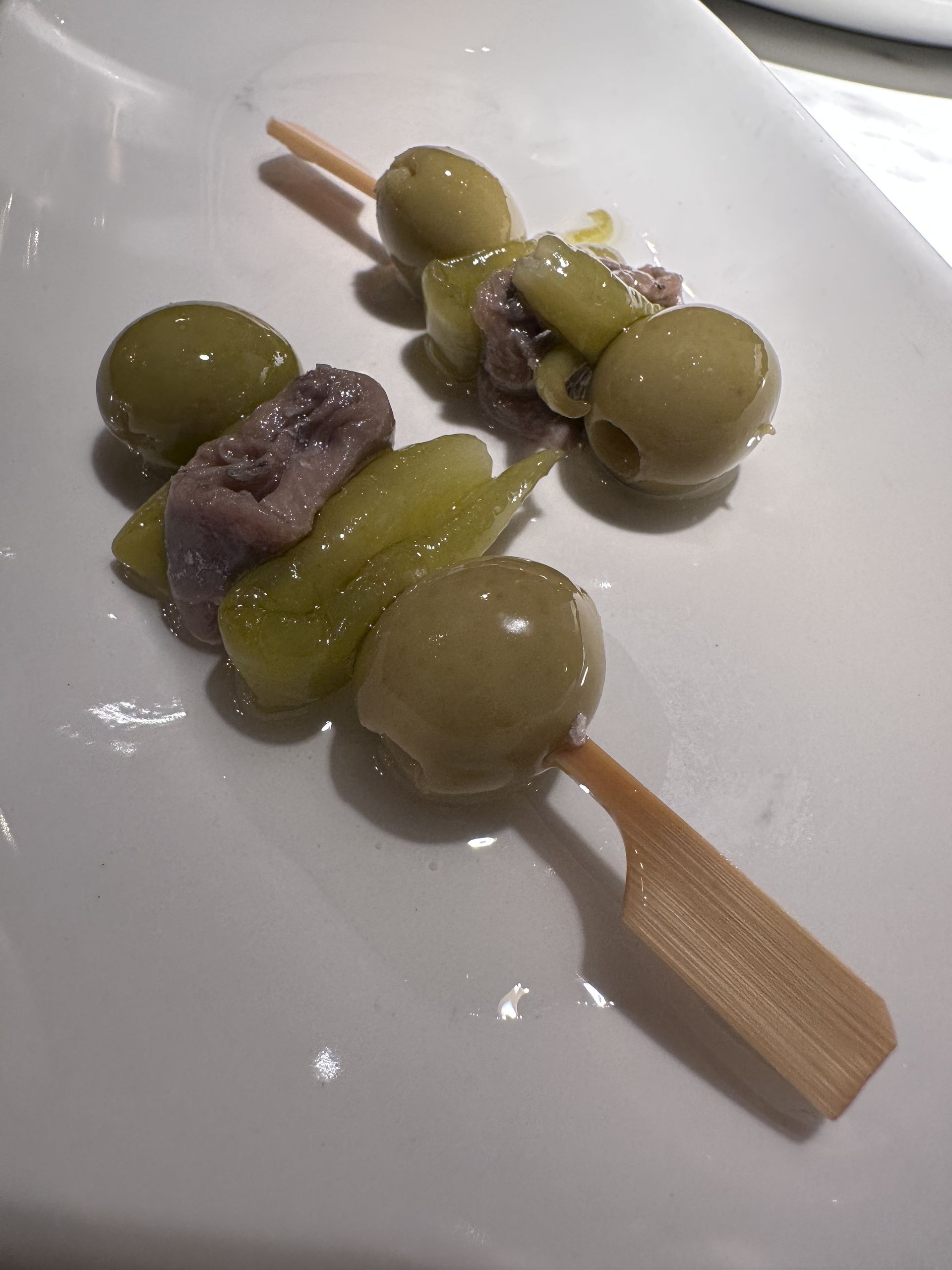 La gilda tradicional con su aceituna, su anchoa y su guindilla.