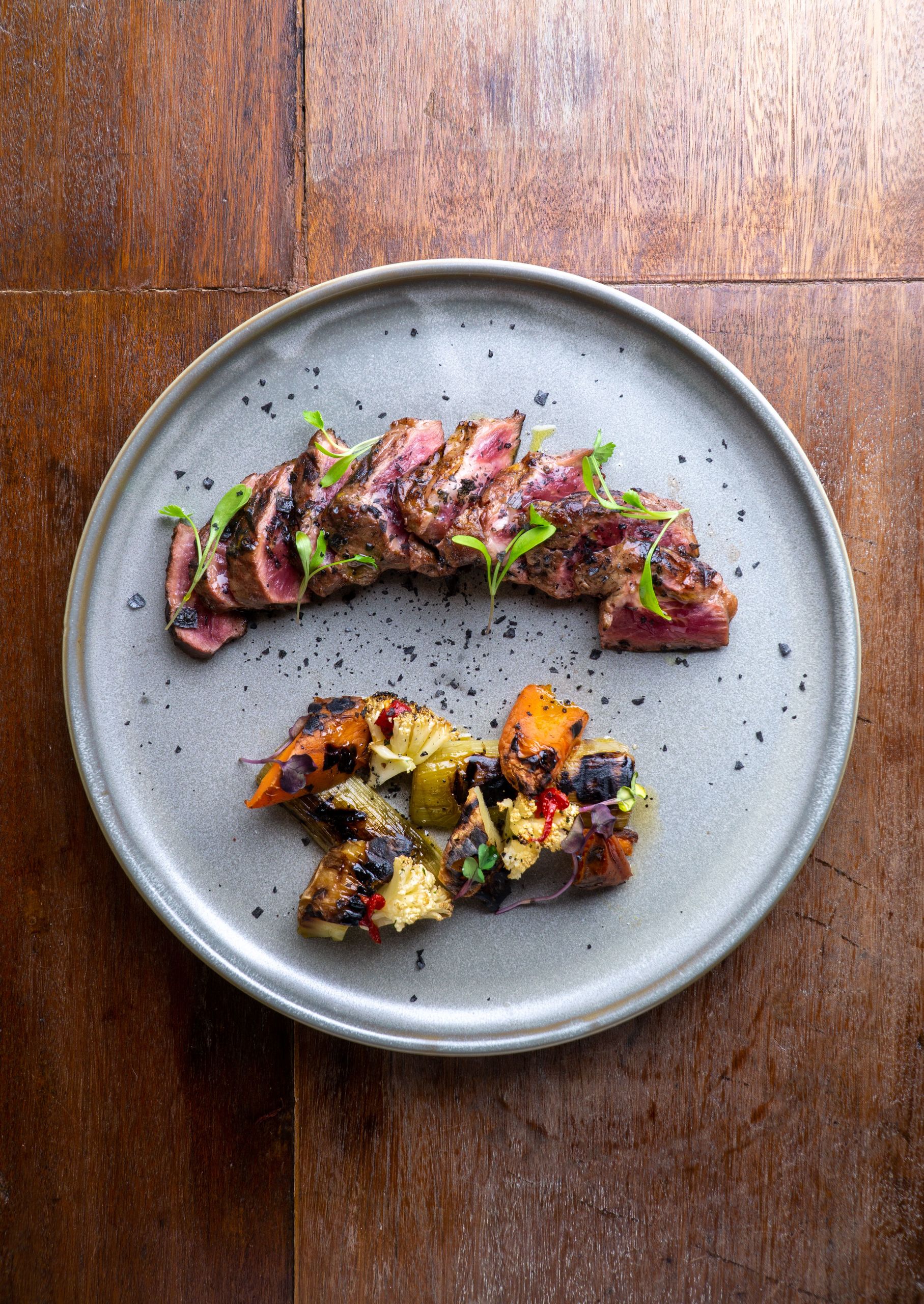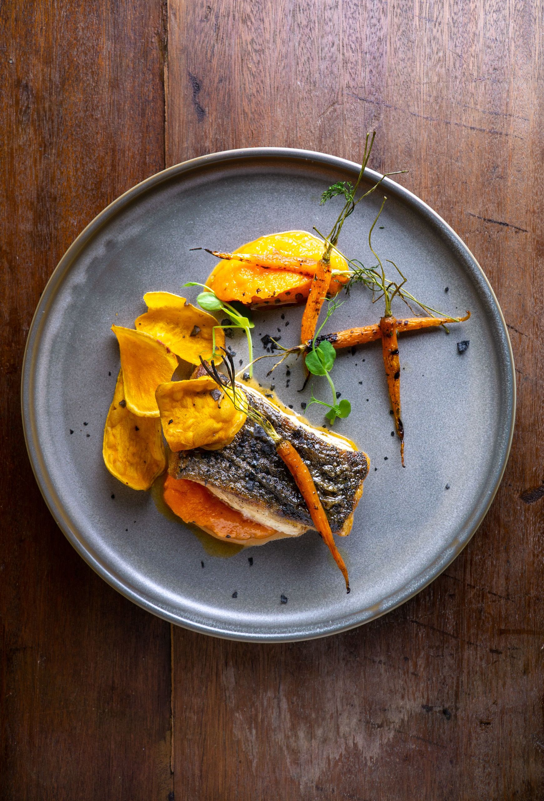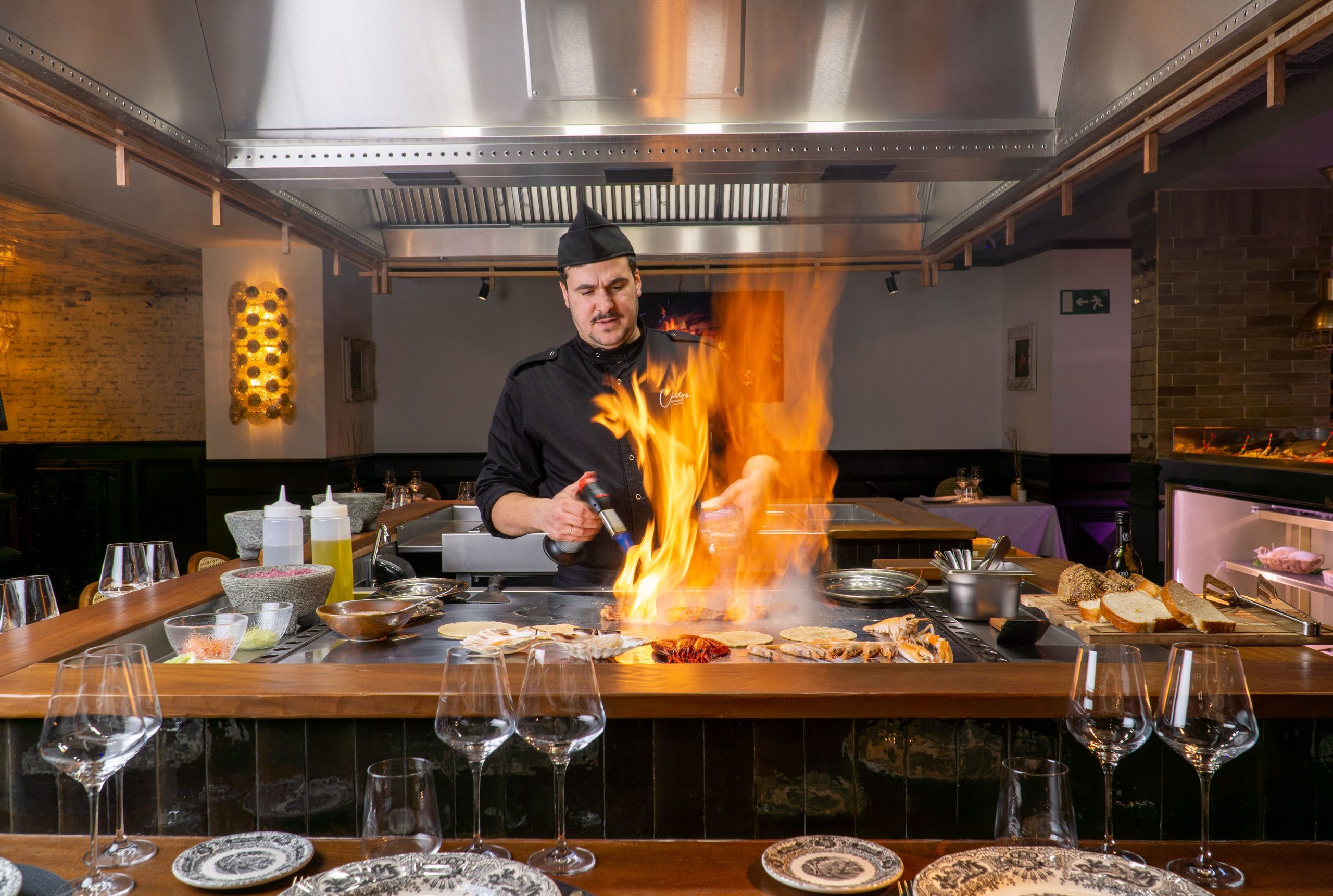 El chef flambea uno de los platos en la parrilla de la Mesa Cícero.