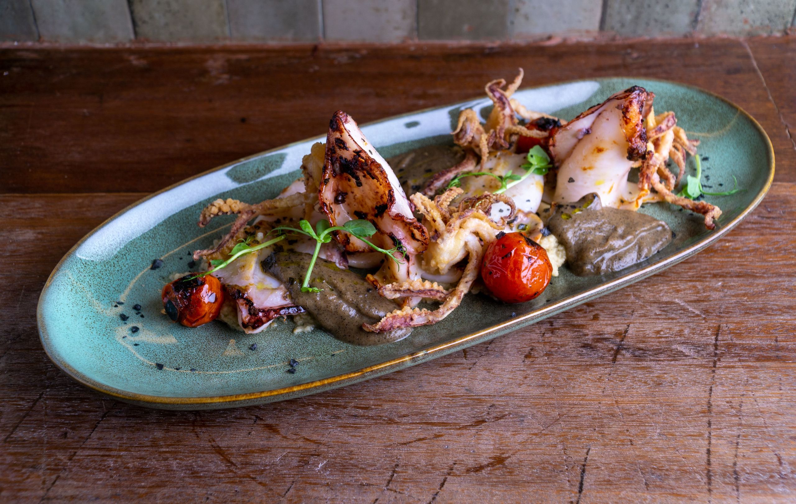 Chipirones salteados con jugo de cebolla caramelizada y sus tentáculos fritos.