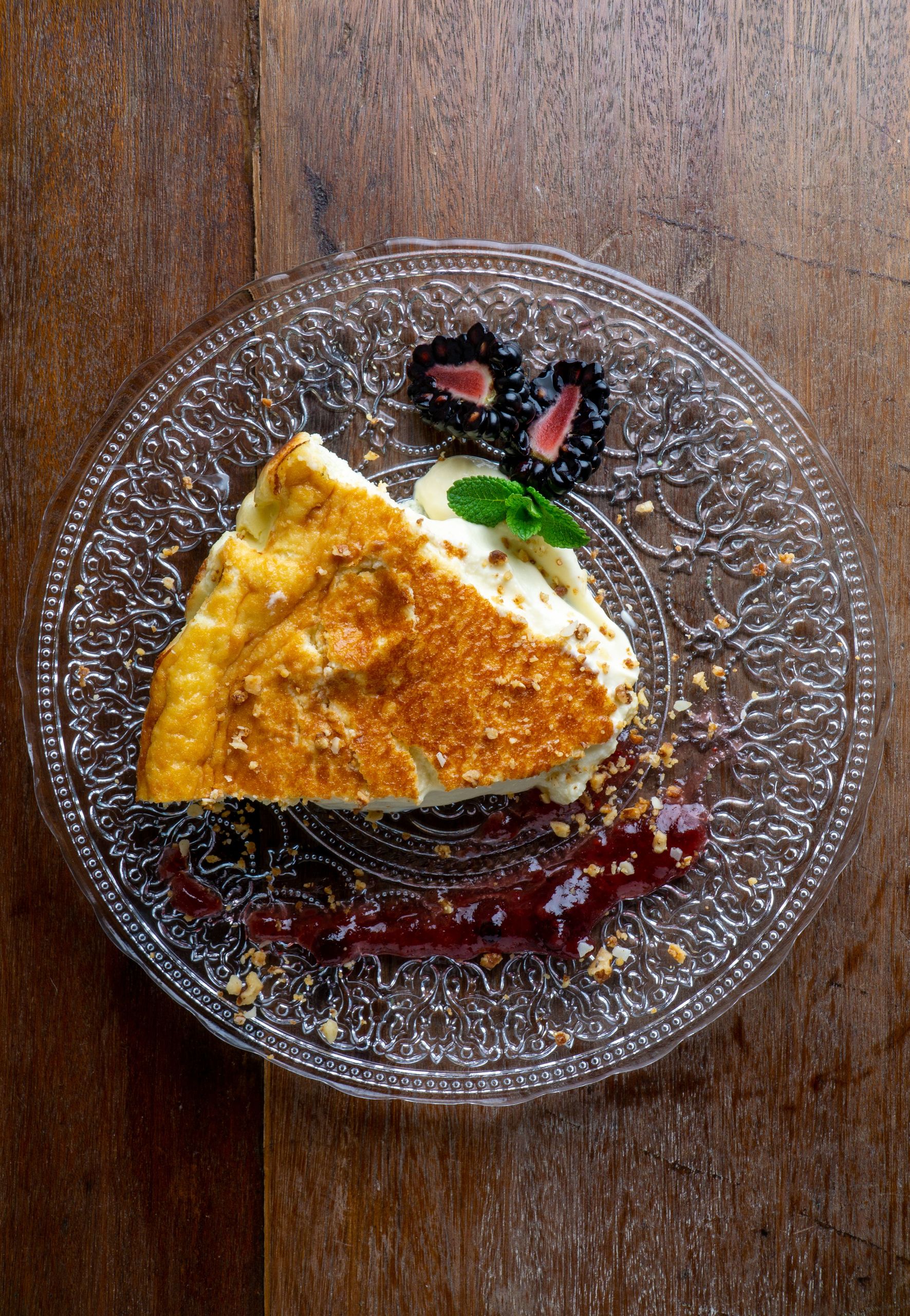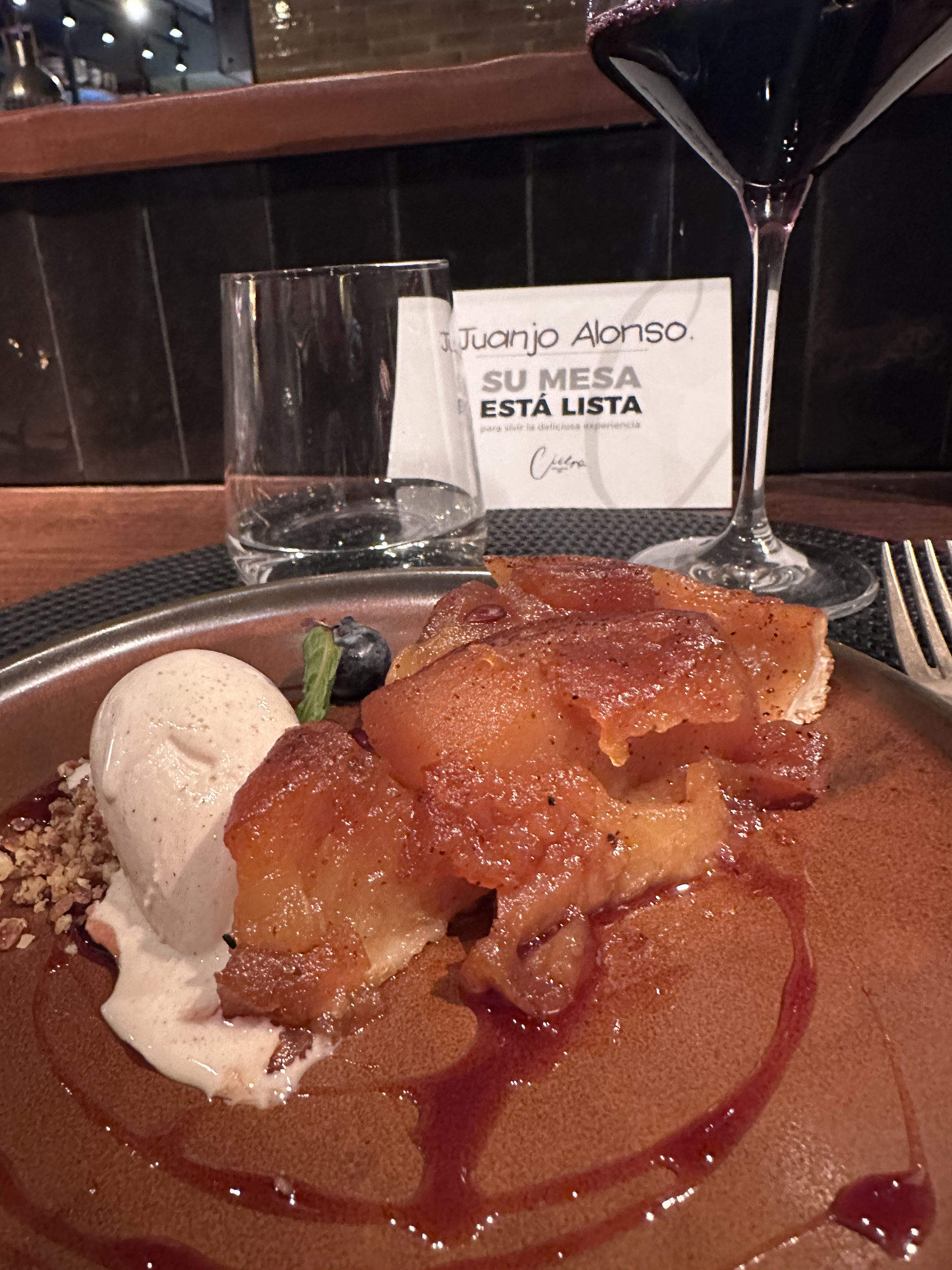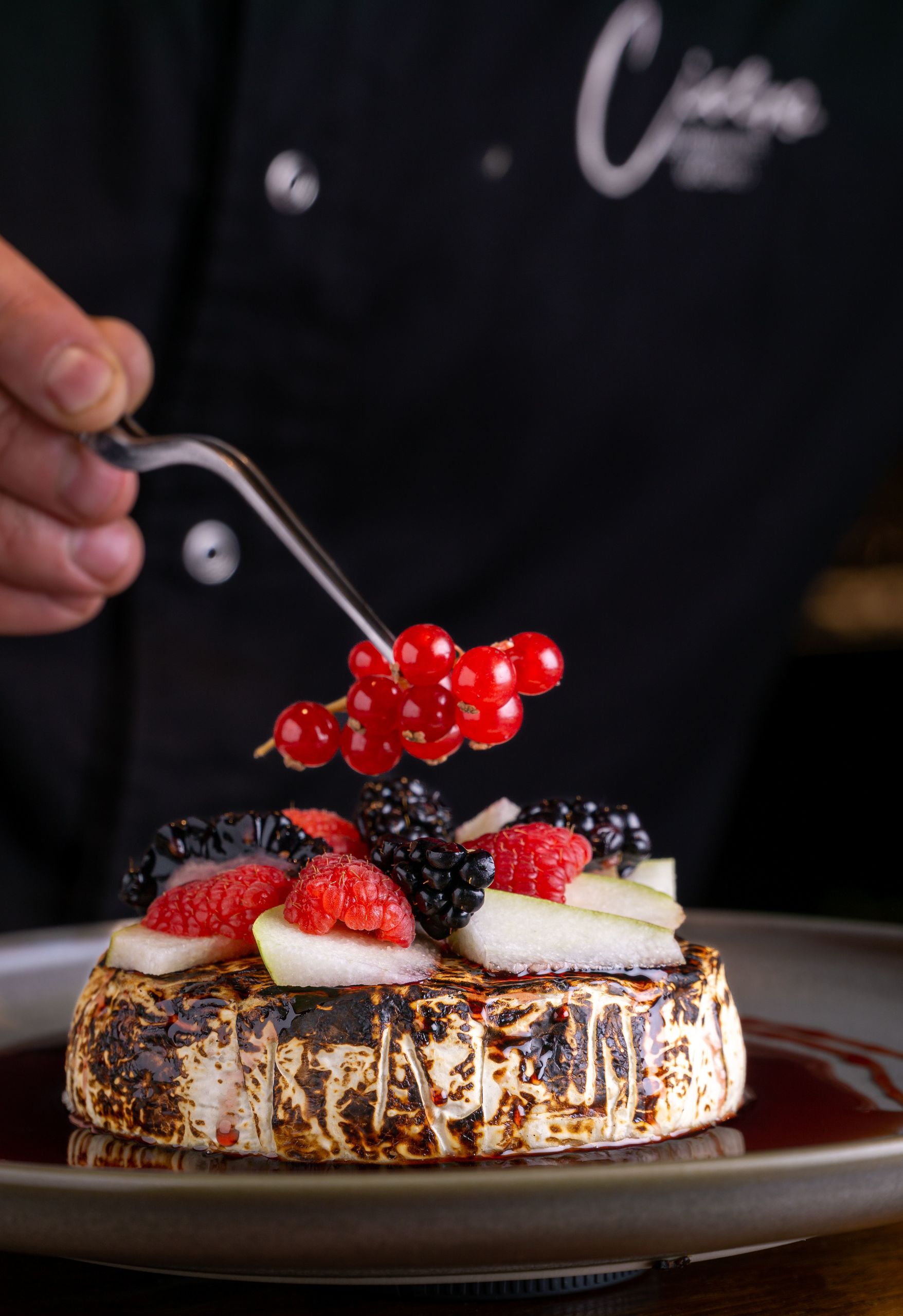 Queso brie al horno de leña en salsa de vino tinto y frutas de temporada.