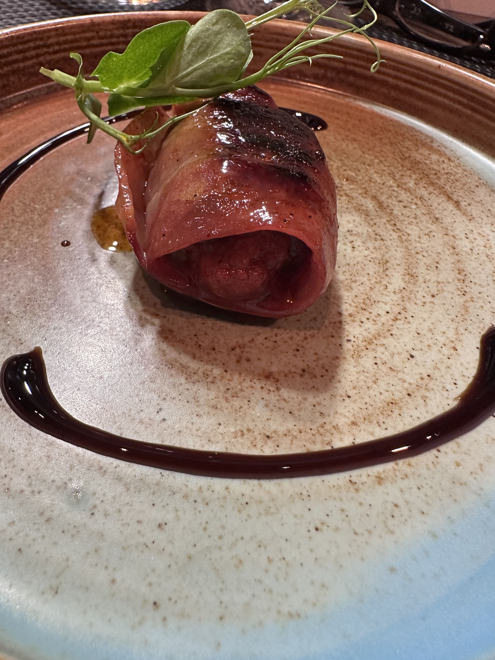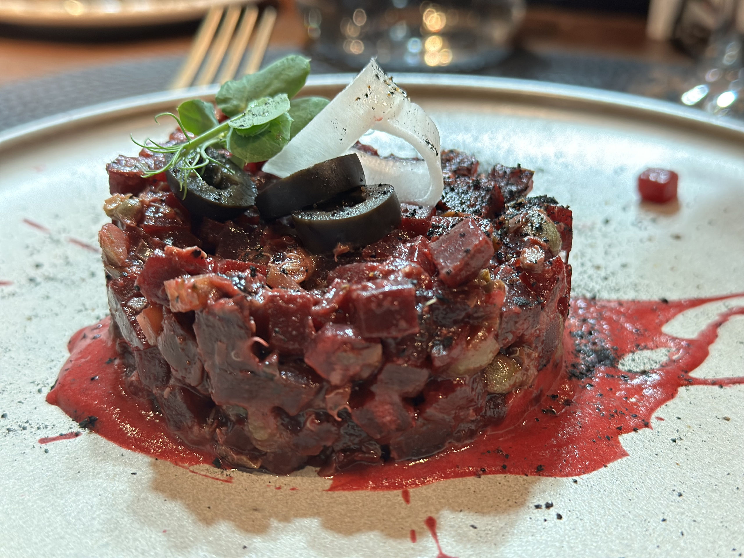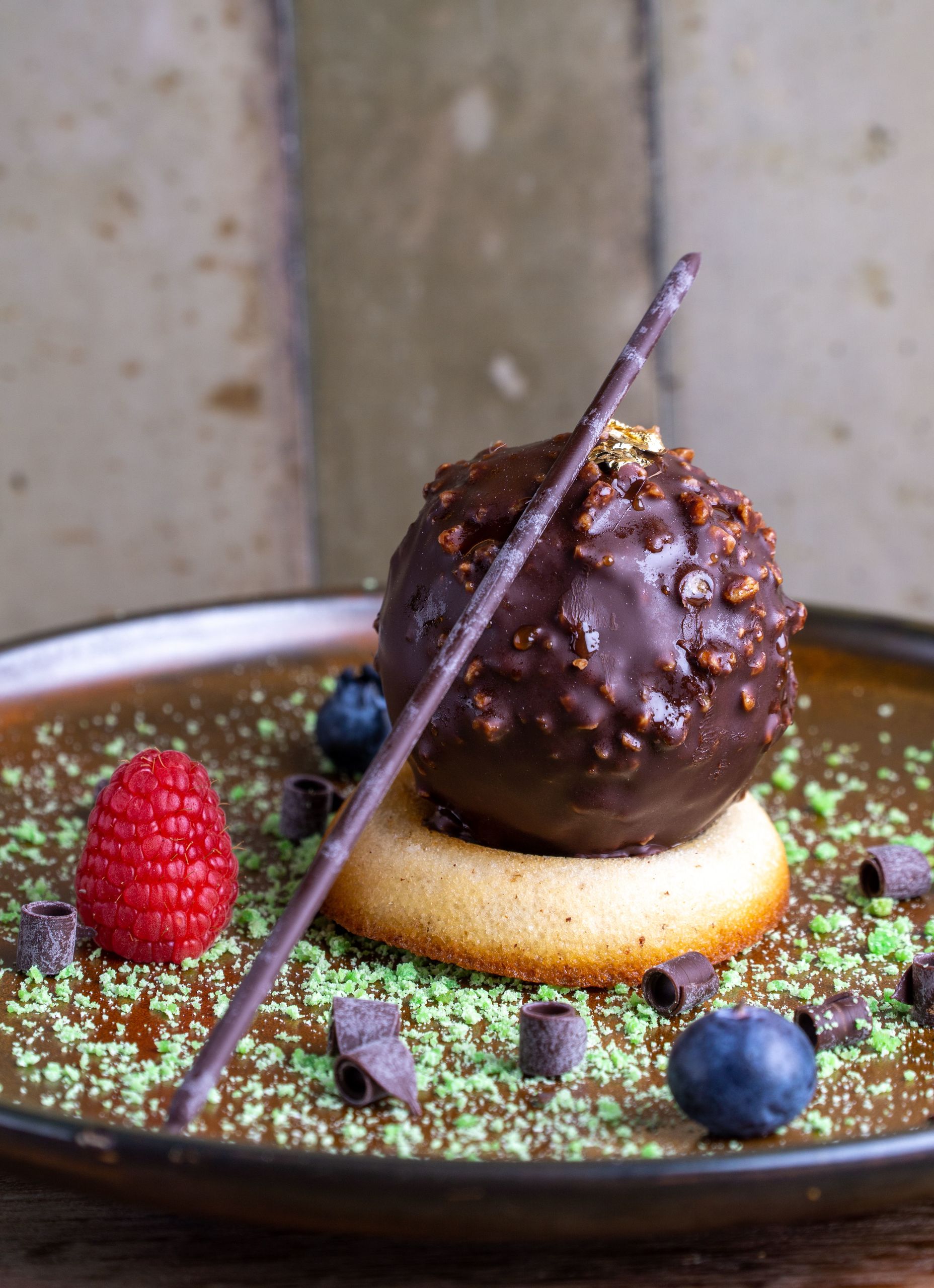 Queso brie al horno de leña en salsa de vino tinto y frutas de temporada.