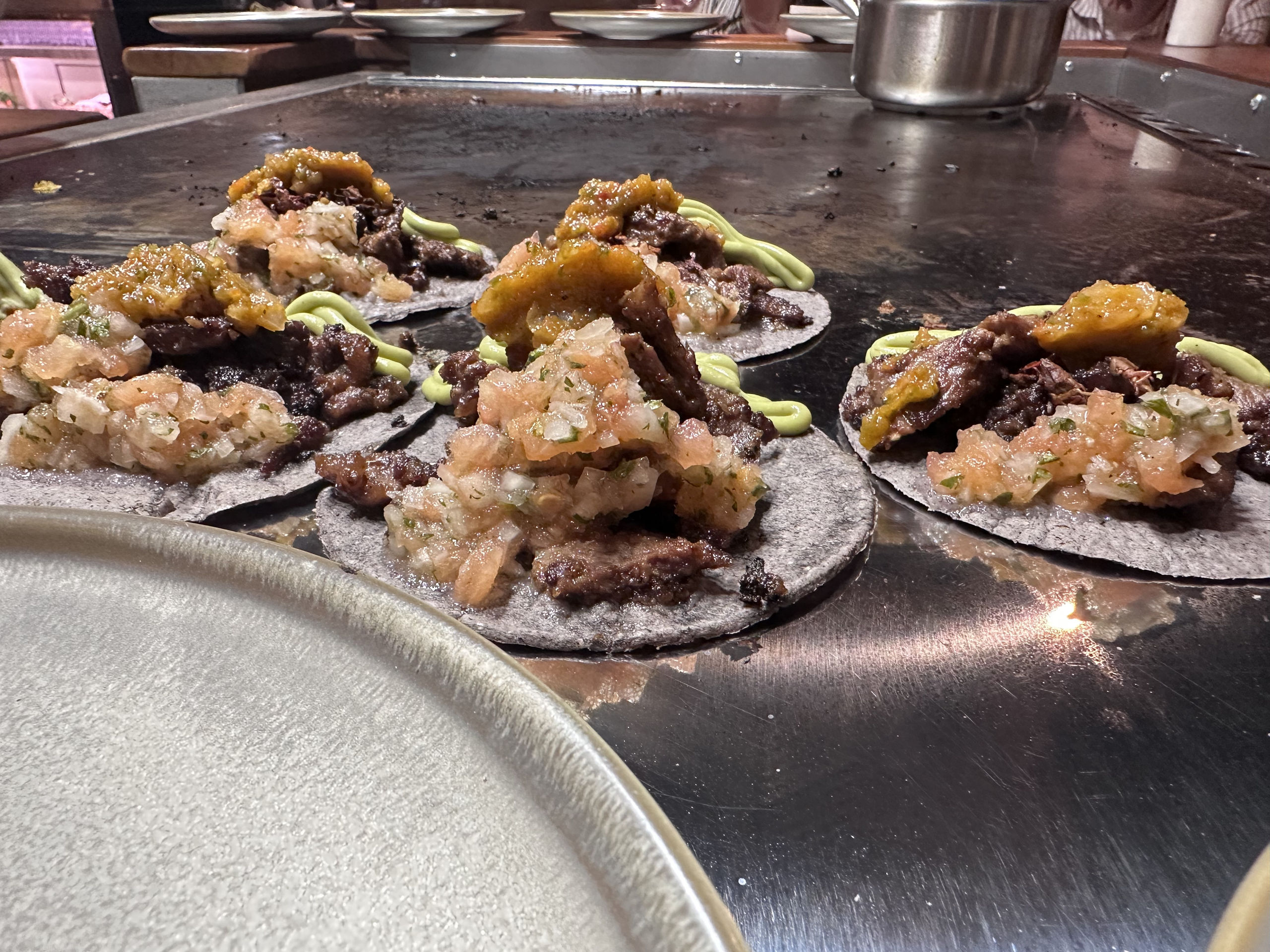 Tacos de rib eye corte fino de Discarlux y flambeados listos para servir.