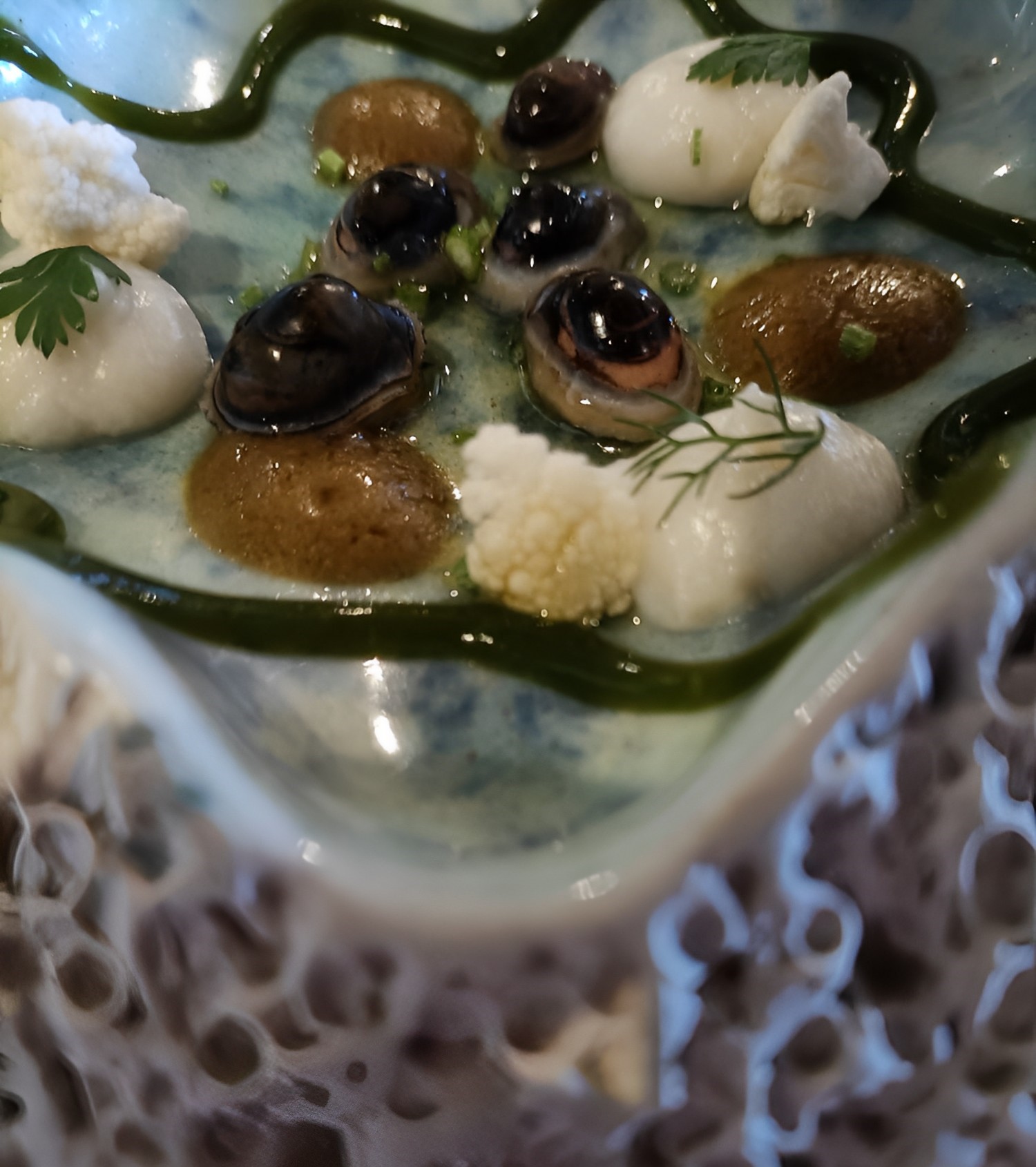Nacho Manzano es un enamorado de la montaña —no hay más que degustar sus láminas de vaca y suero de mantequilla—, pero también del mar. No en vano, aprendió a cocinar en Gijón y en su memoria permanece el olor de los chigres y de las playas. Ese olor característico " a salitre, a yodo fresco" que él ha trasladado a su plato de llámpares con coliflor y codium. "Huele como un acantilado de Cabo de Peñas o de Llanes", evoca. "La cocina de Casa Marcial es una sensación de lo que pasa fuera para meterlo en el plato".