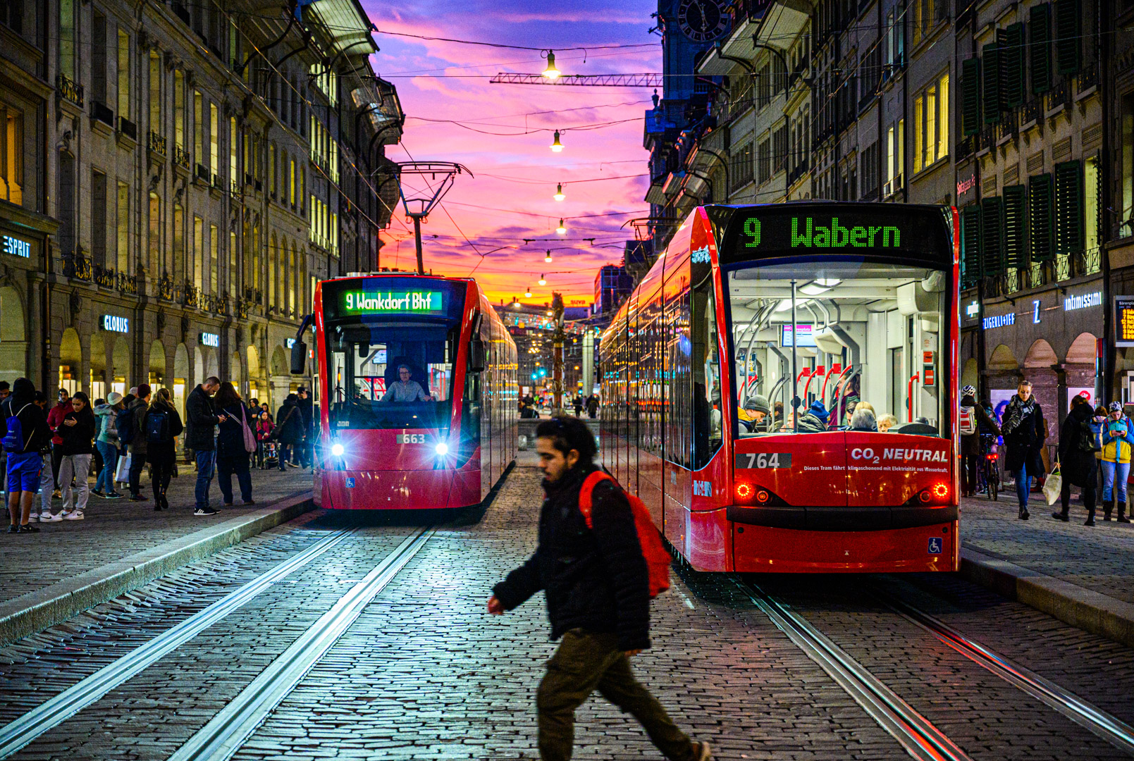 Los tranvías, protagonistas de la vida diaria en las calles del casco histórico de la ciudad, en las que se mezclan a la perfección los peatones, los coches (pocos) y los tranvías.
