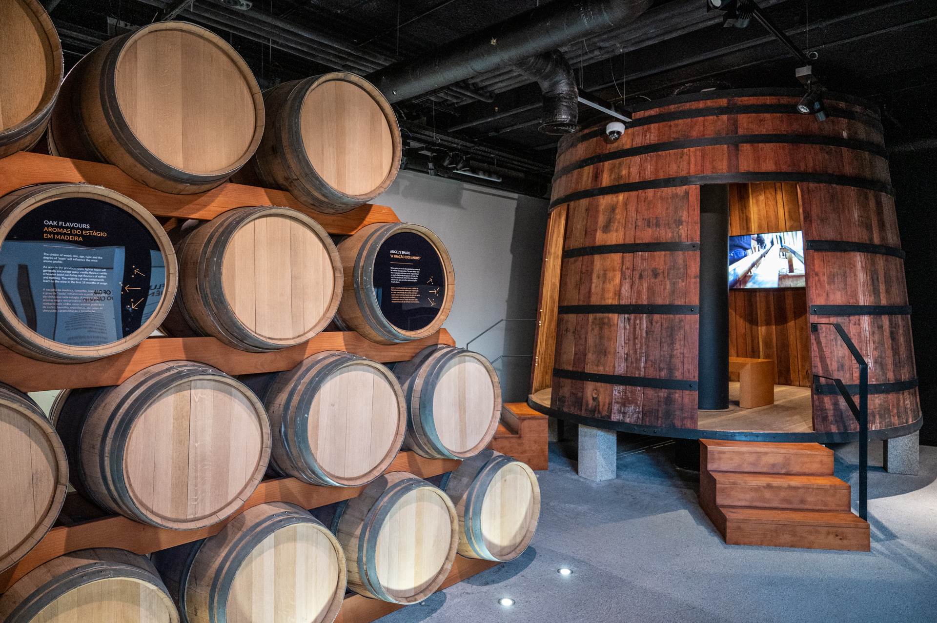 Barricas de vino colocadas con carteles explicativos en uno de los principales museos del nuevo barrio cultural de Oporto, The Wine Experience.