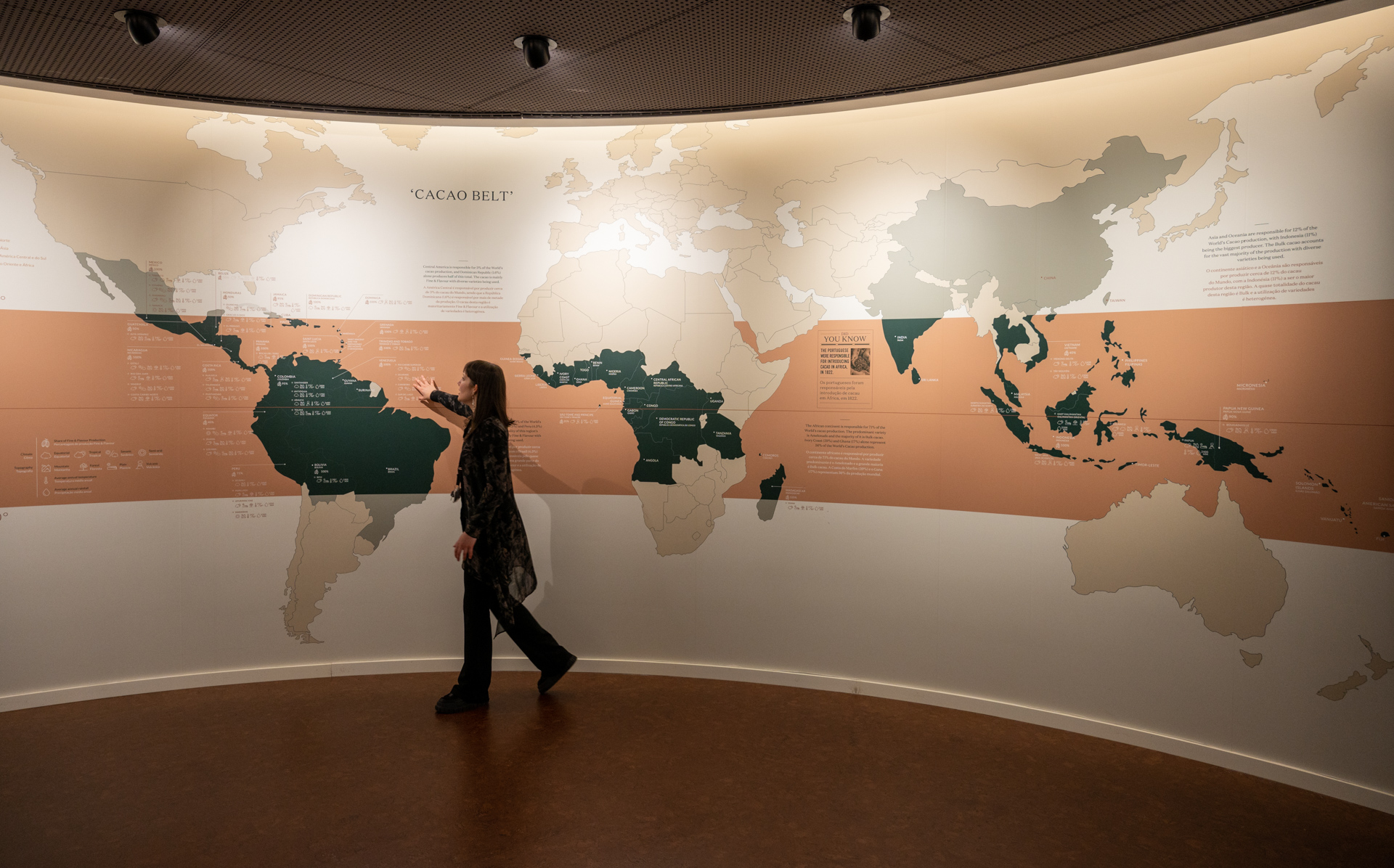 En el museo del chocolate, un gran mapa muestra la zona del planeta donde es posible cultivar cacao y las variedades que se obtienen en cada continente.