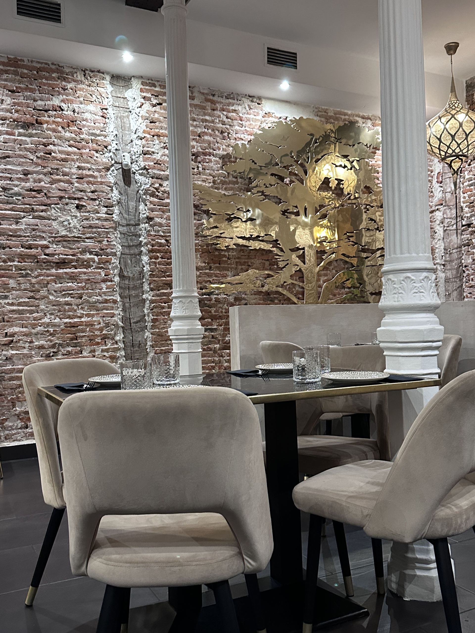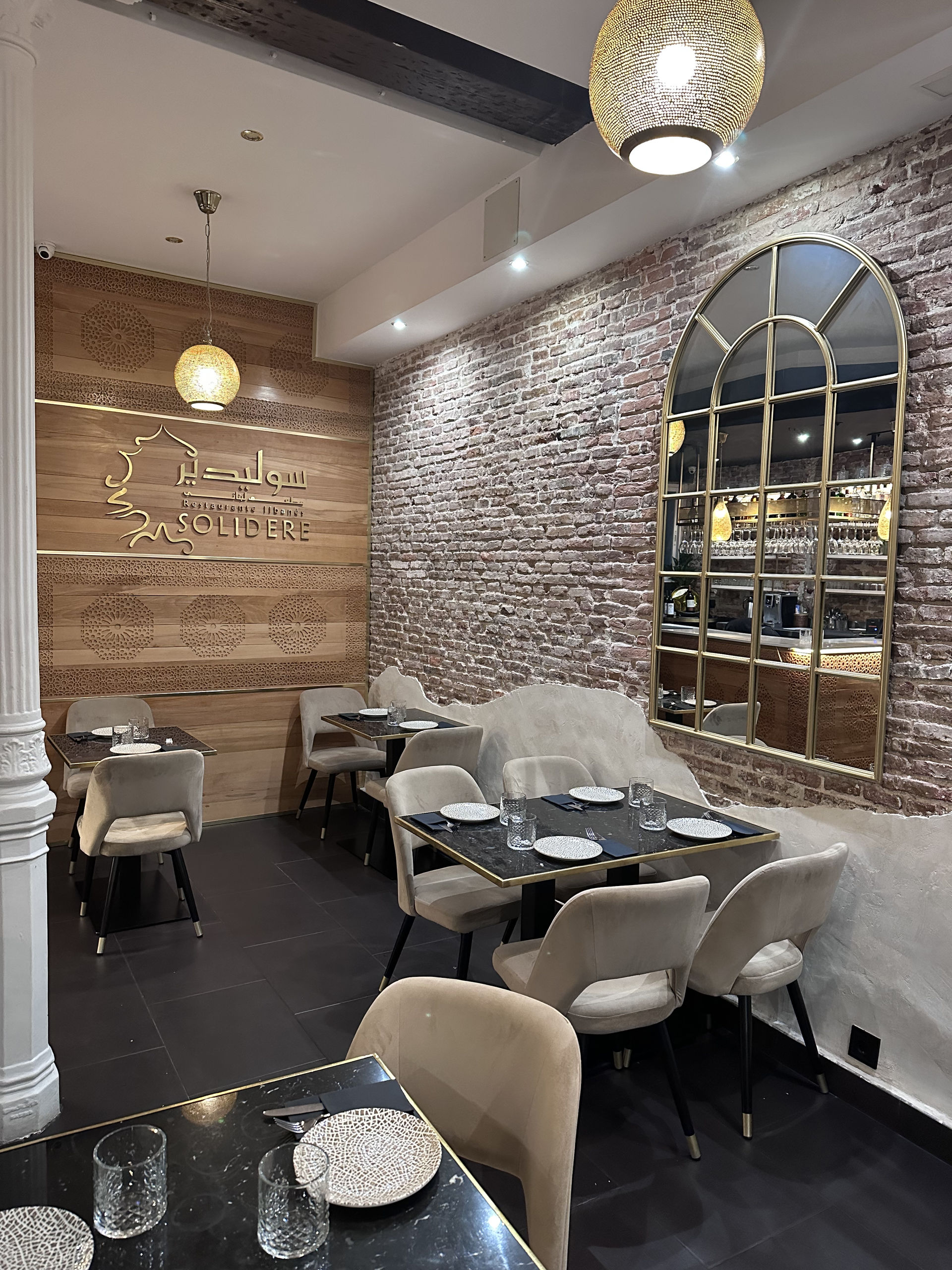 La planta baja de Solidere ofrece numerosas mesas para disfrutar de esta cocina libanesa con una decoración en la que predomina el blanco, los adornos dorados, las mesas de madera y los tapizados en terciopelo.
