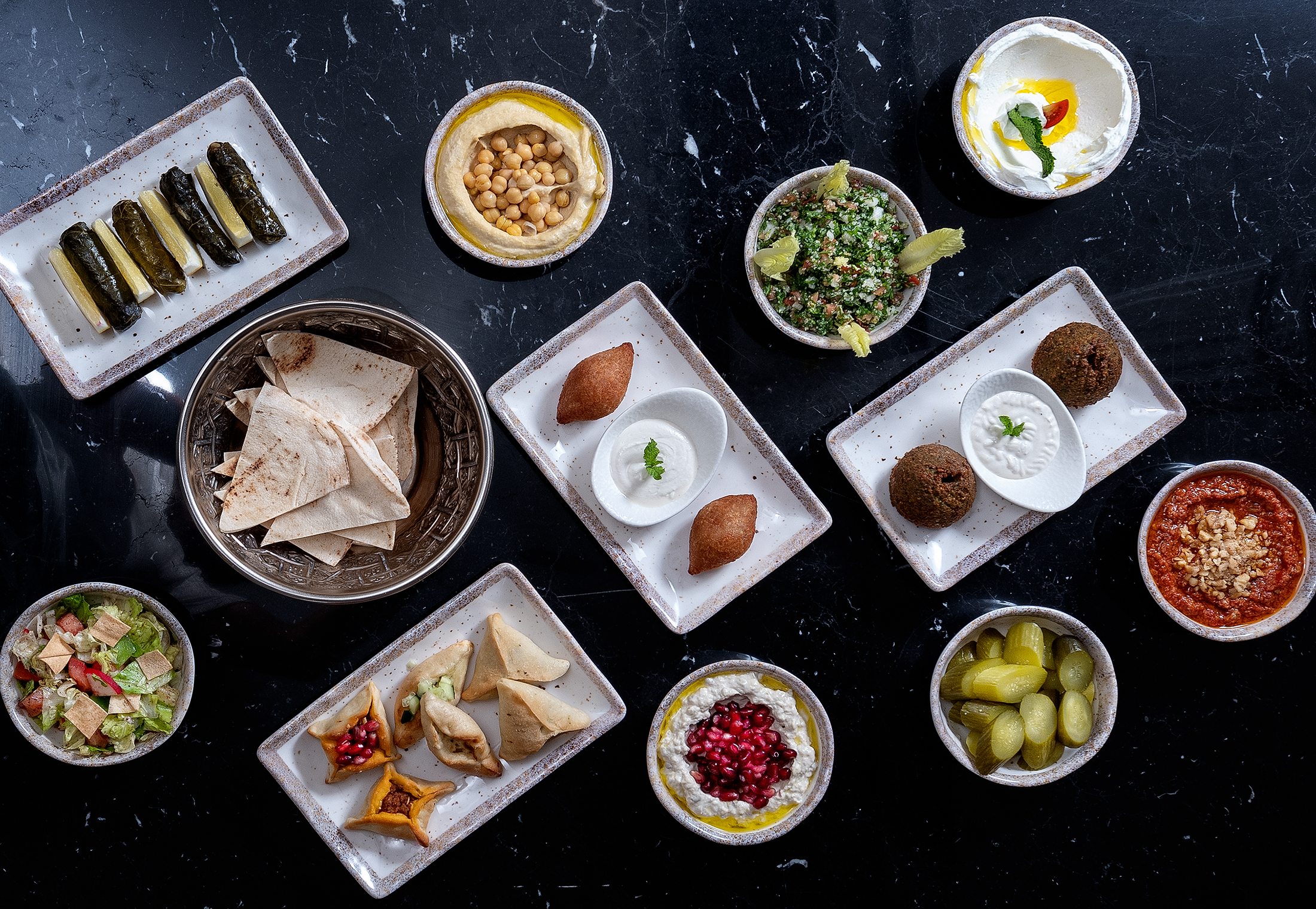 La cocina libanesa cada vez cuenta con más incondicionales. En la imagen vemos una selección de los entrantes fríos y calientes que ofrece la carta y el menú degustación de Solidere.