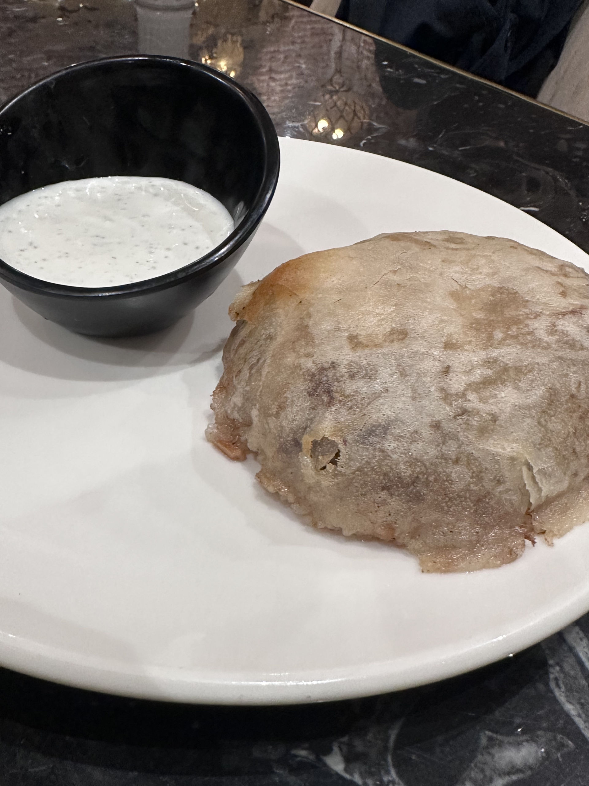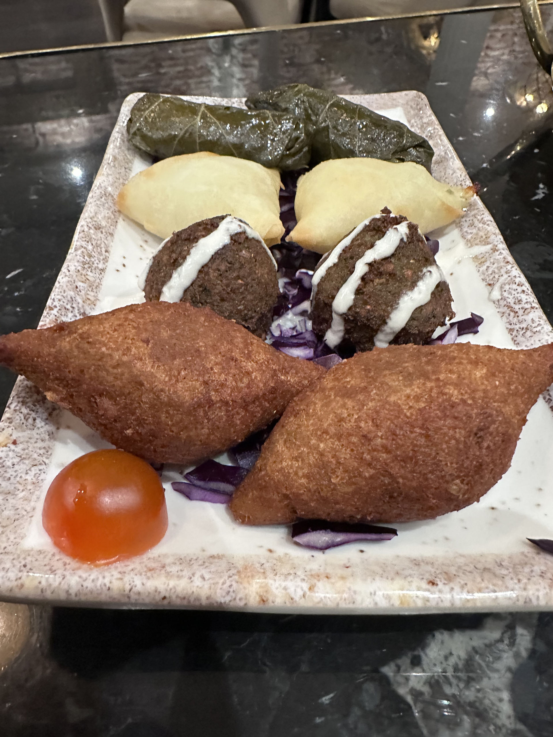 Los entrantes calientes del menú degustación de Solidere están compuestos por: kibbe, falafel, sambusak bil-jibne y warak enaf.