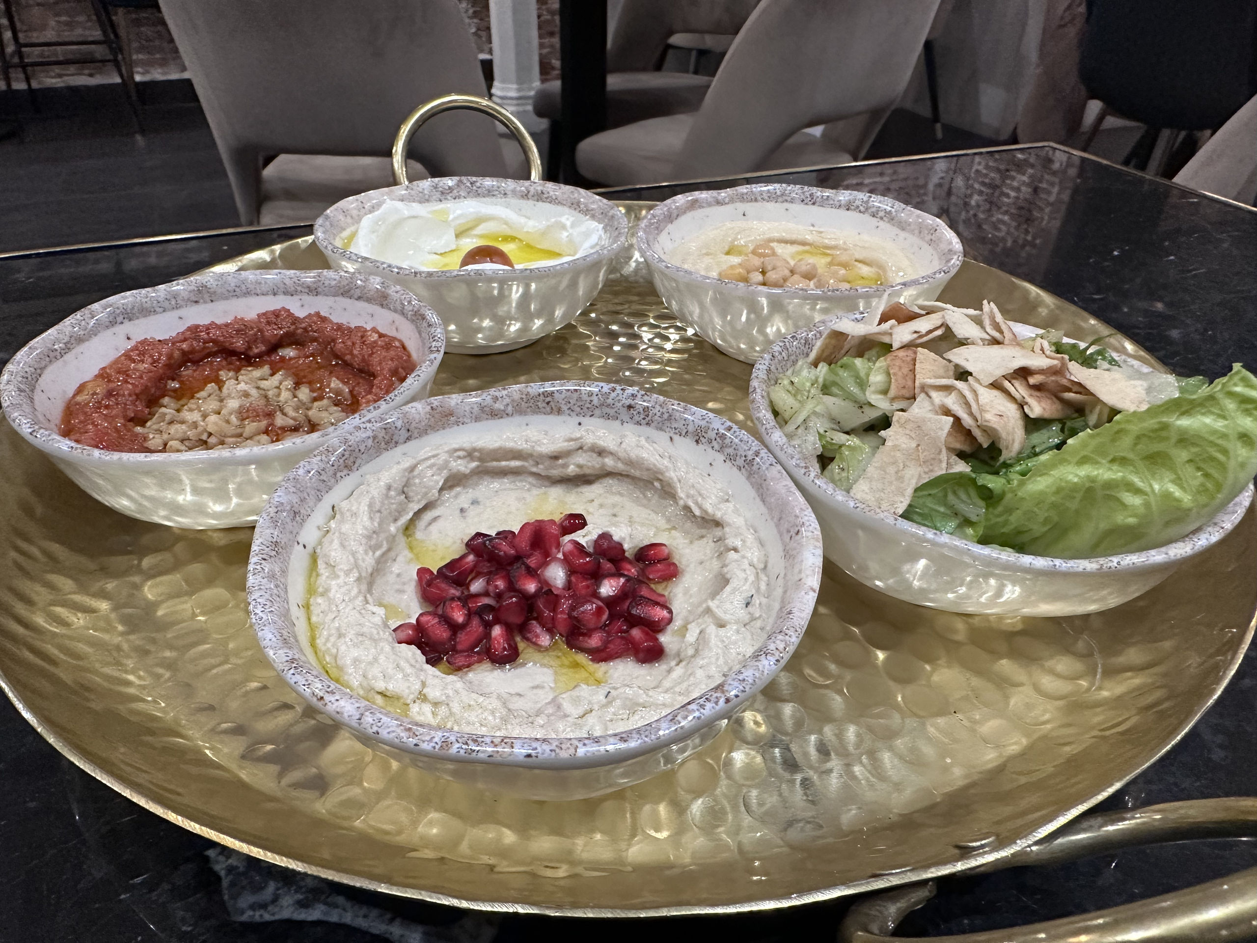 Los entrantes frío del menú degustación de Solidere están compuestos por: muttabal, muhammara, labne, hommos y fattush.