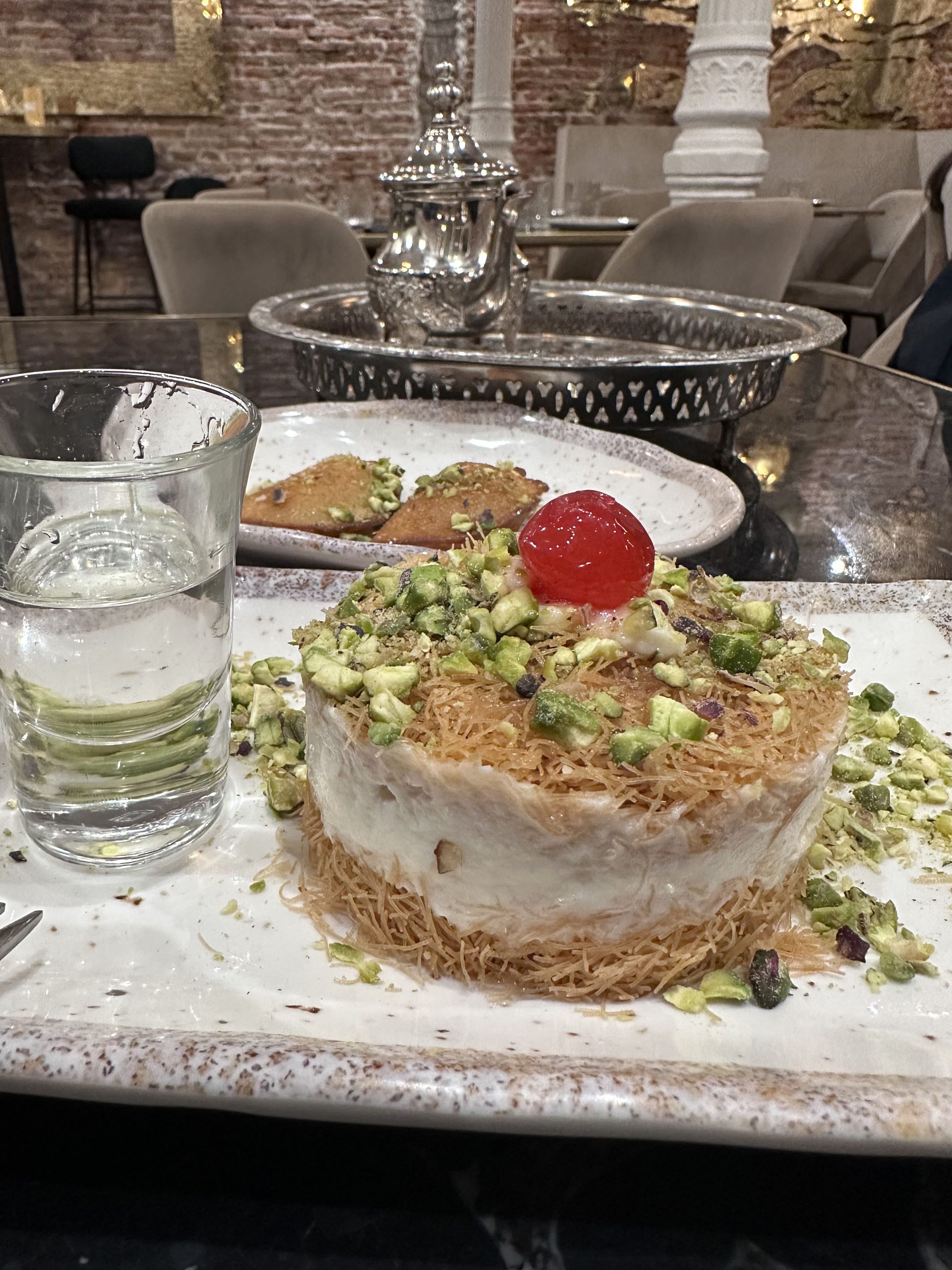 Postres de atayef de queso, unas tortitas libanesas rellenas de queso y pistacho, pasadas por almíbar y agua de azahar; y othmalieh, una masa de fideos horneados con crema de leche libanesa.