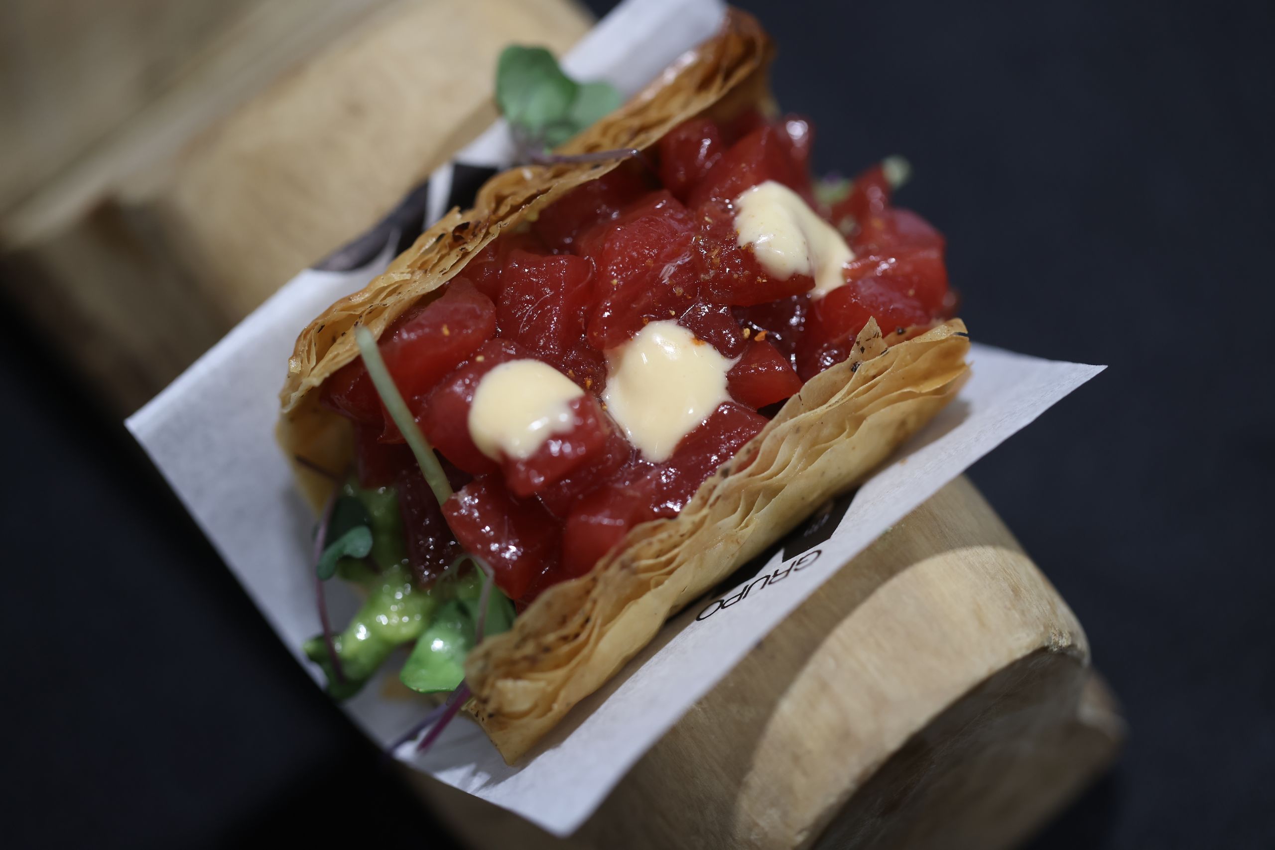 La tapa "Japotaco de atún" con la que José Antonio Guerrero Juan, del restaurante Aquarium Port (Ciutadella, Menorca) ha ganado GourmeTapa by Fuentes, el primer campeonato de tapas elaboradas con atún rojo de Fuentes.