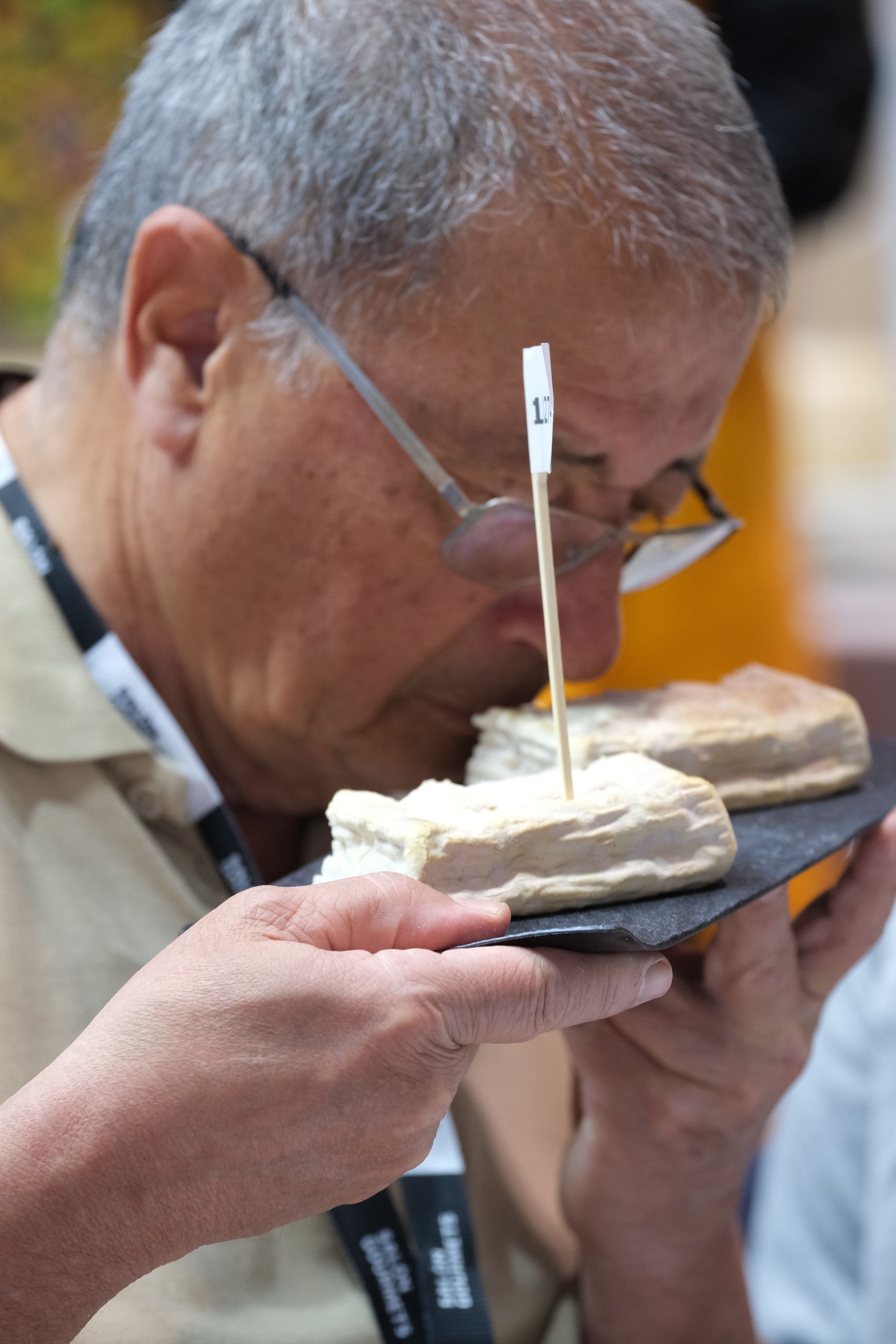 Uno de los jueces huele uno de los quesos durante el Campeonato de los Mejores Quesos de España 2023 en el que han participado más de 820 quesos.