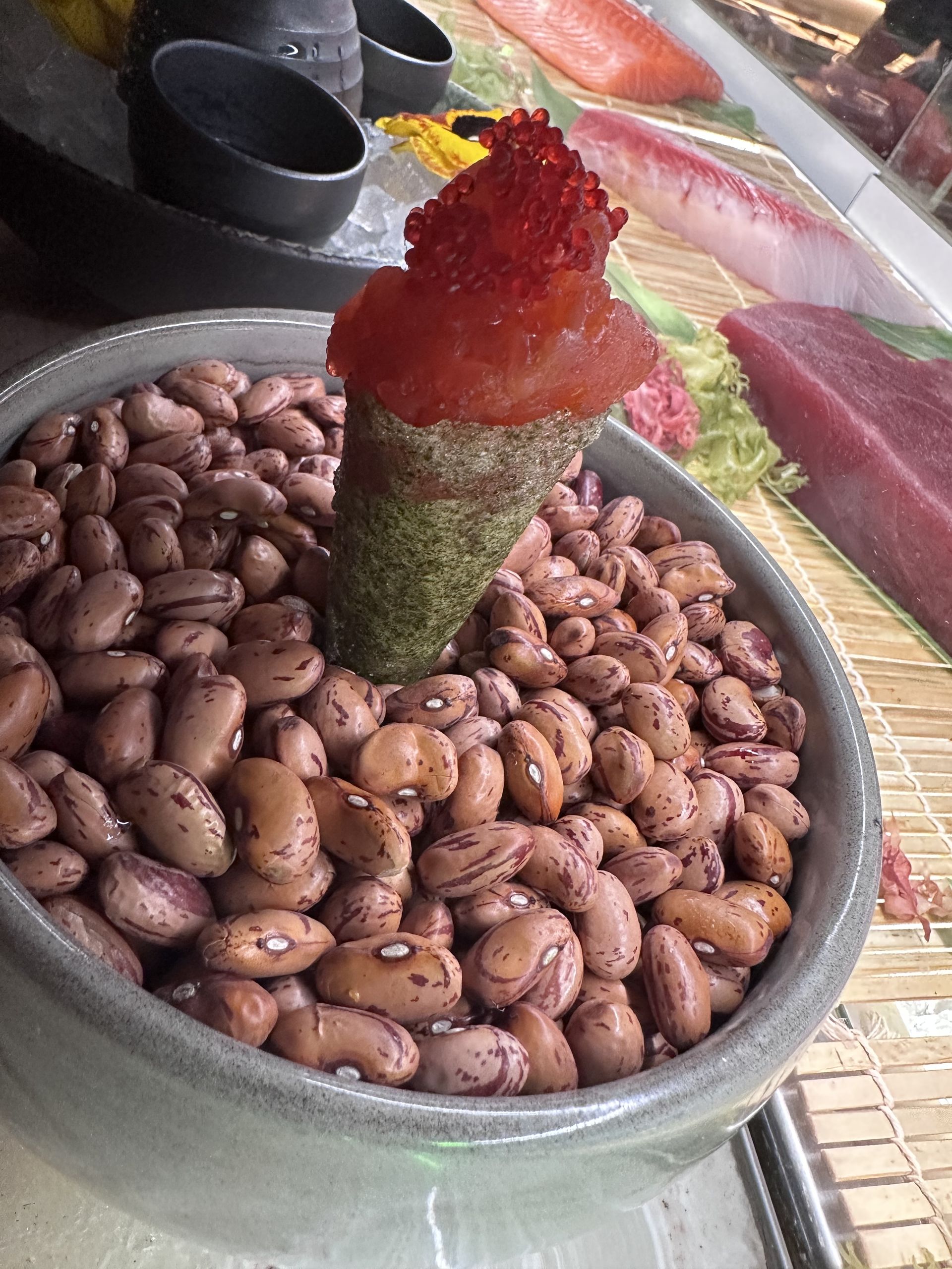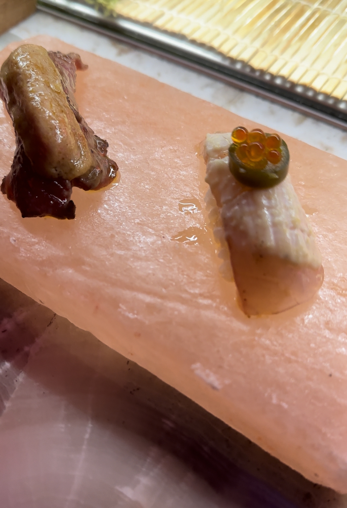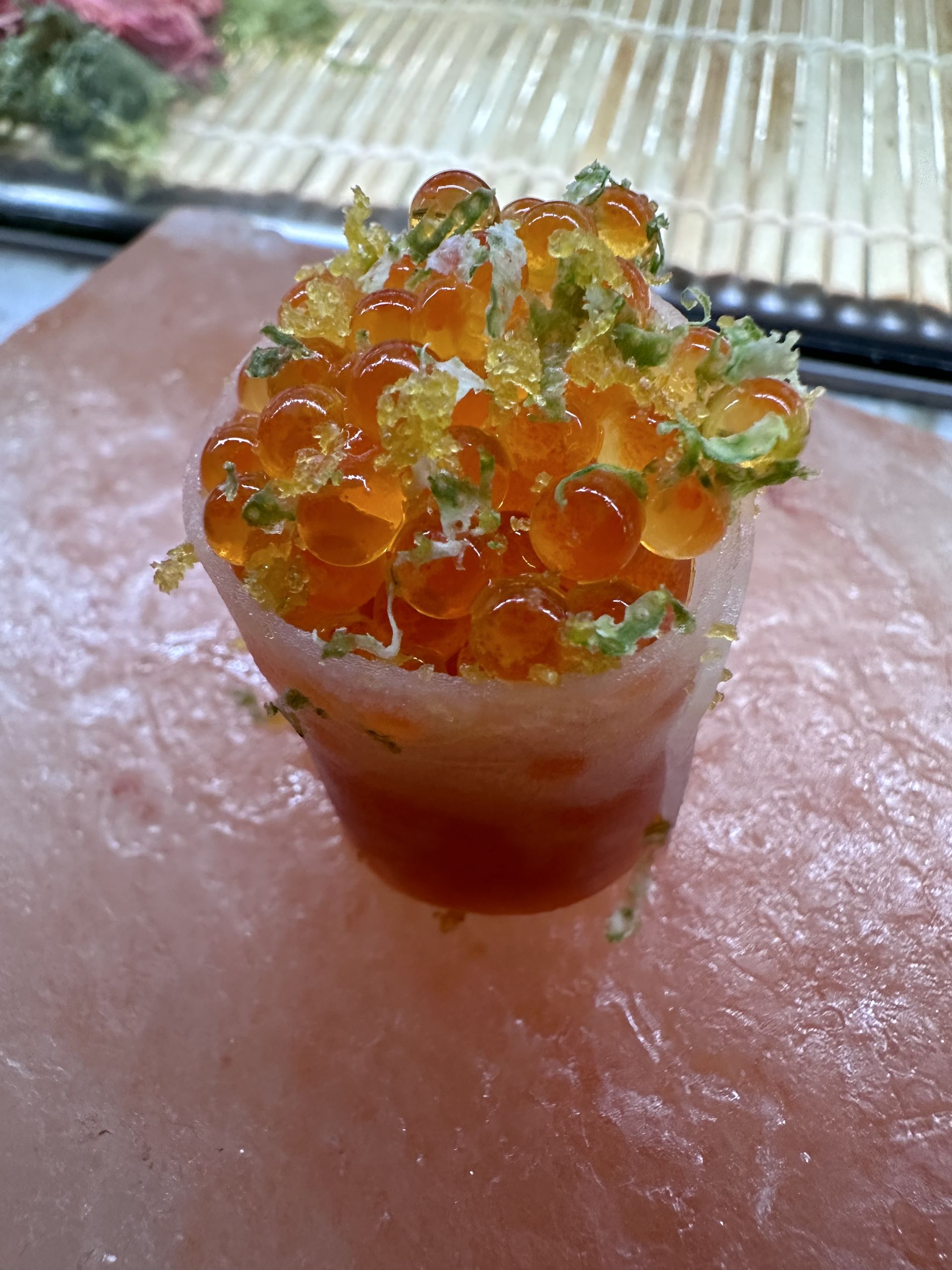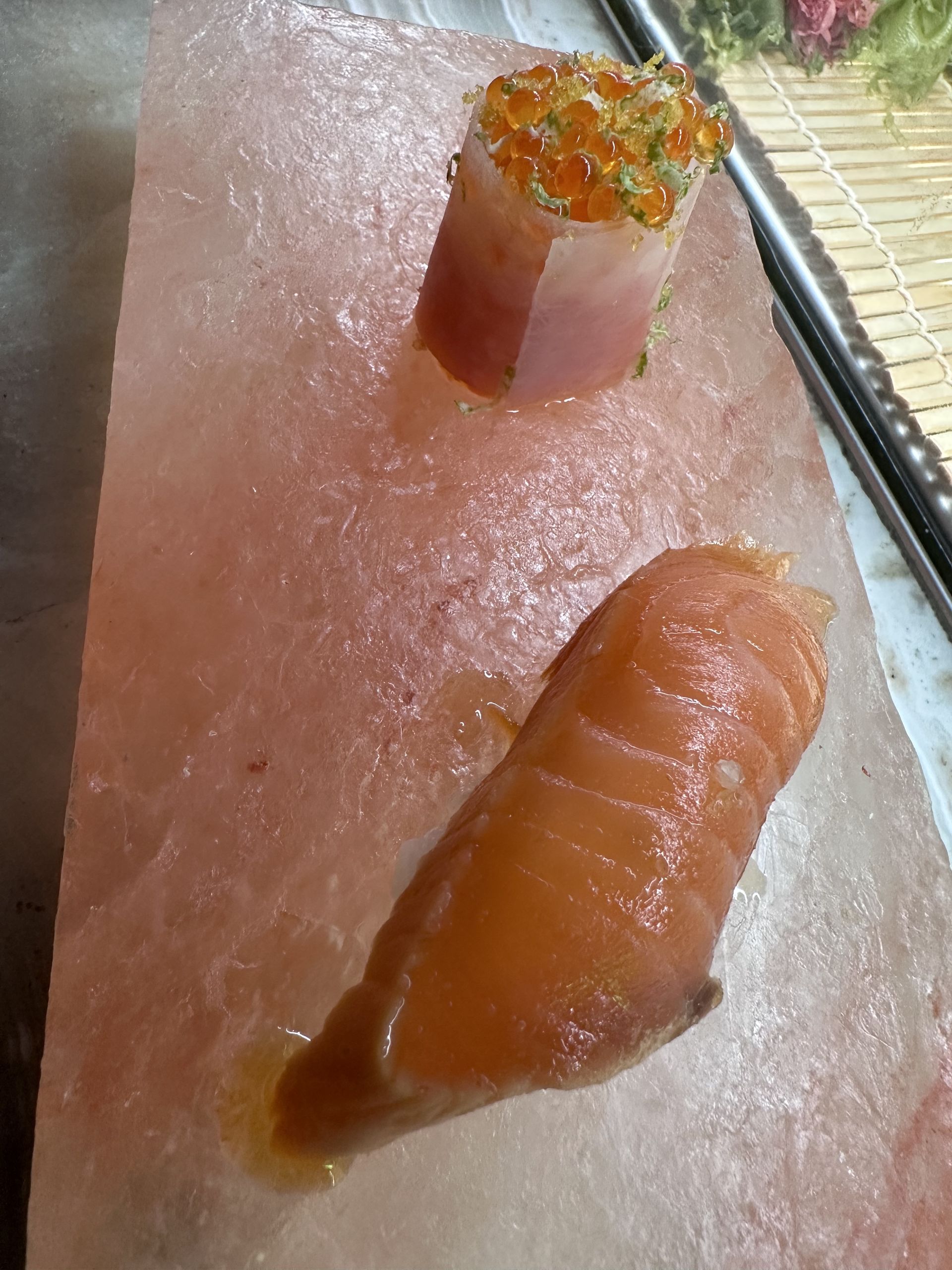 Buenísimo el gunkan de salmón con huevas y ralladura de lima.
