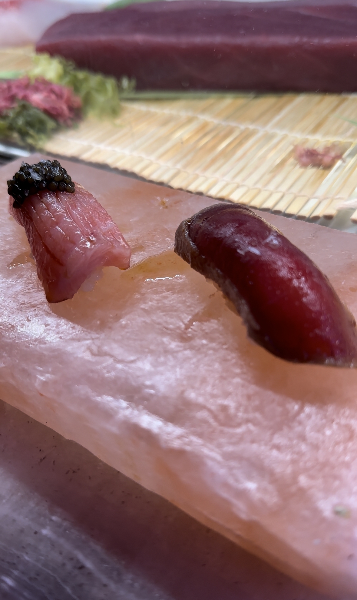 De la dupla de niguiri de atún sellado y el niguiri de atún toro con caviar también sobre sale el último, sobre todo por la calidad del toro y la corona de las huevas de esturión.