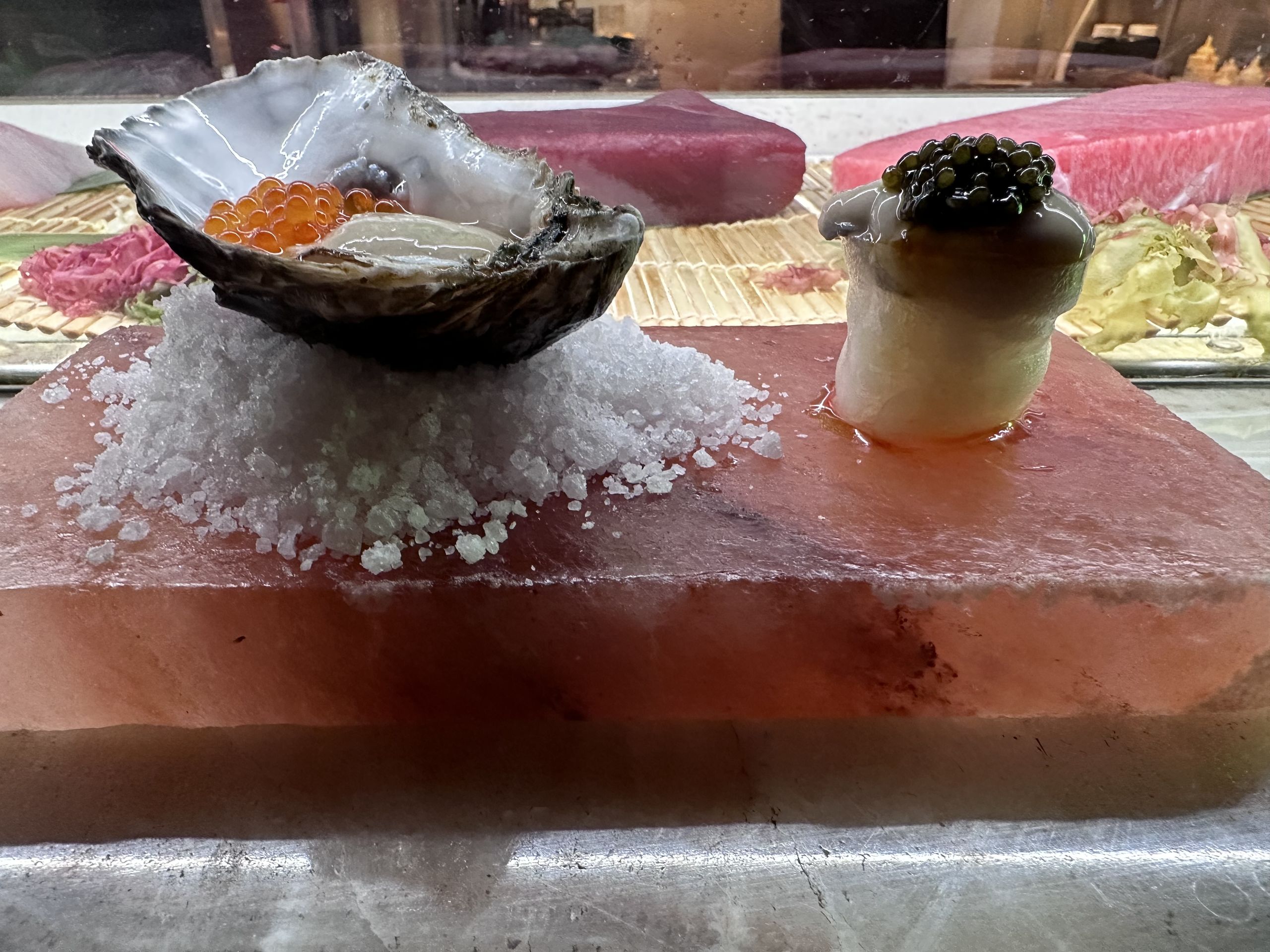 Empezamos con un par de ostras, la ya clásica ostra ponzu que fusiona el sabor del mar con la salsa. La otra es una absoluta maravilla. El gunkan de ostra con caviar, en el que la mezcla del arroz del sushi con la ostra y el caviar lleva a este marisco a un nivel supremo. Sin duda un umami de libro.