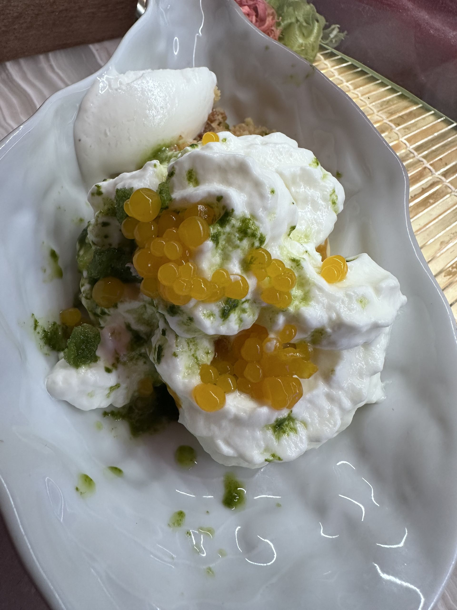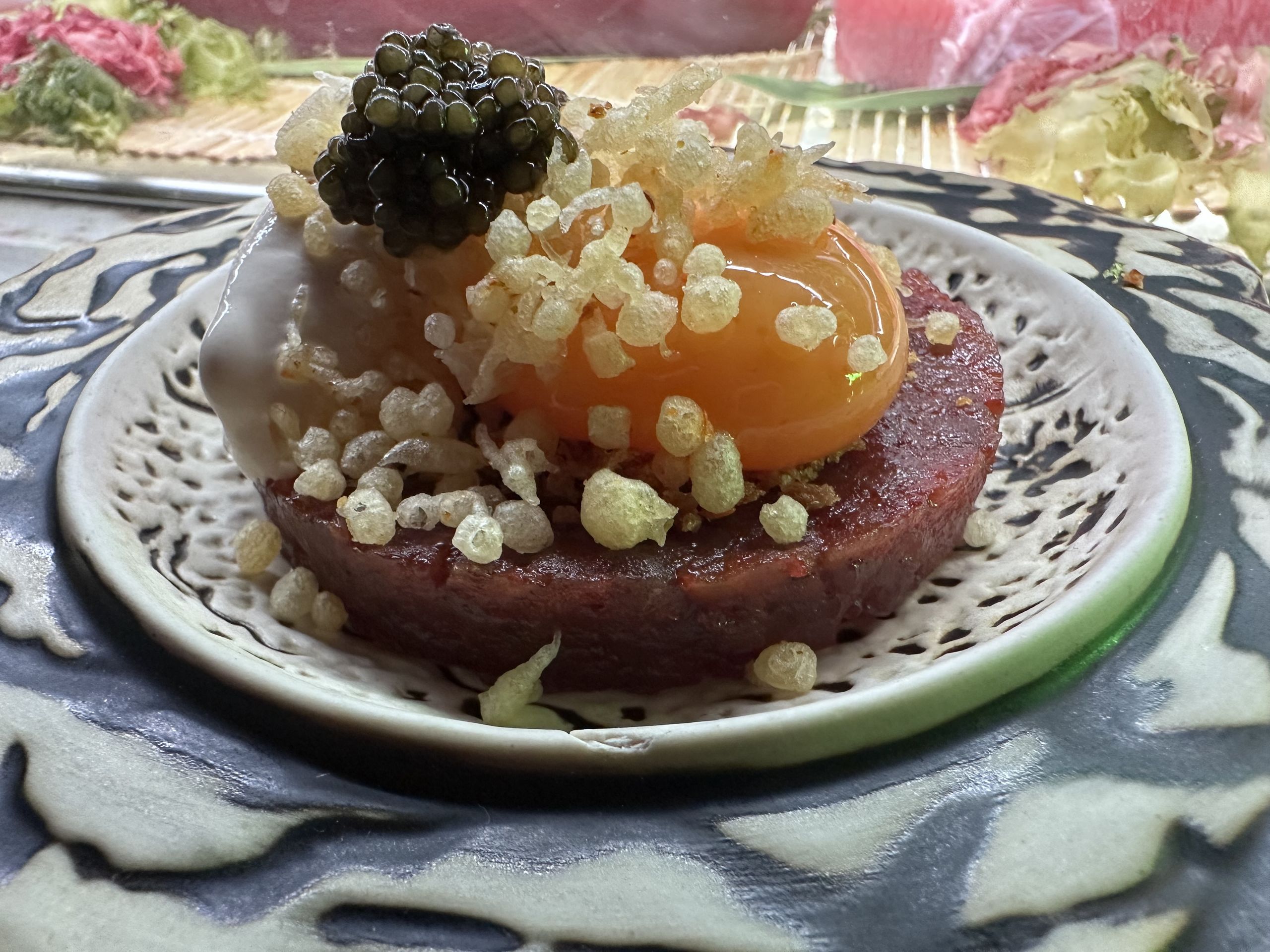 También destaca el tartar de atún, helado de miso ibérico y yema de huevo encurtido en ponzu y coronado con caviar. De nuevo la mezcla que vas degustando cucharada a cuchara envuelve tu boca con deliciosos matices.