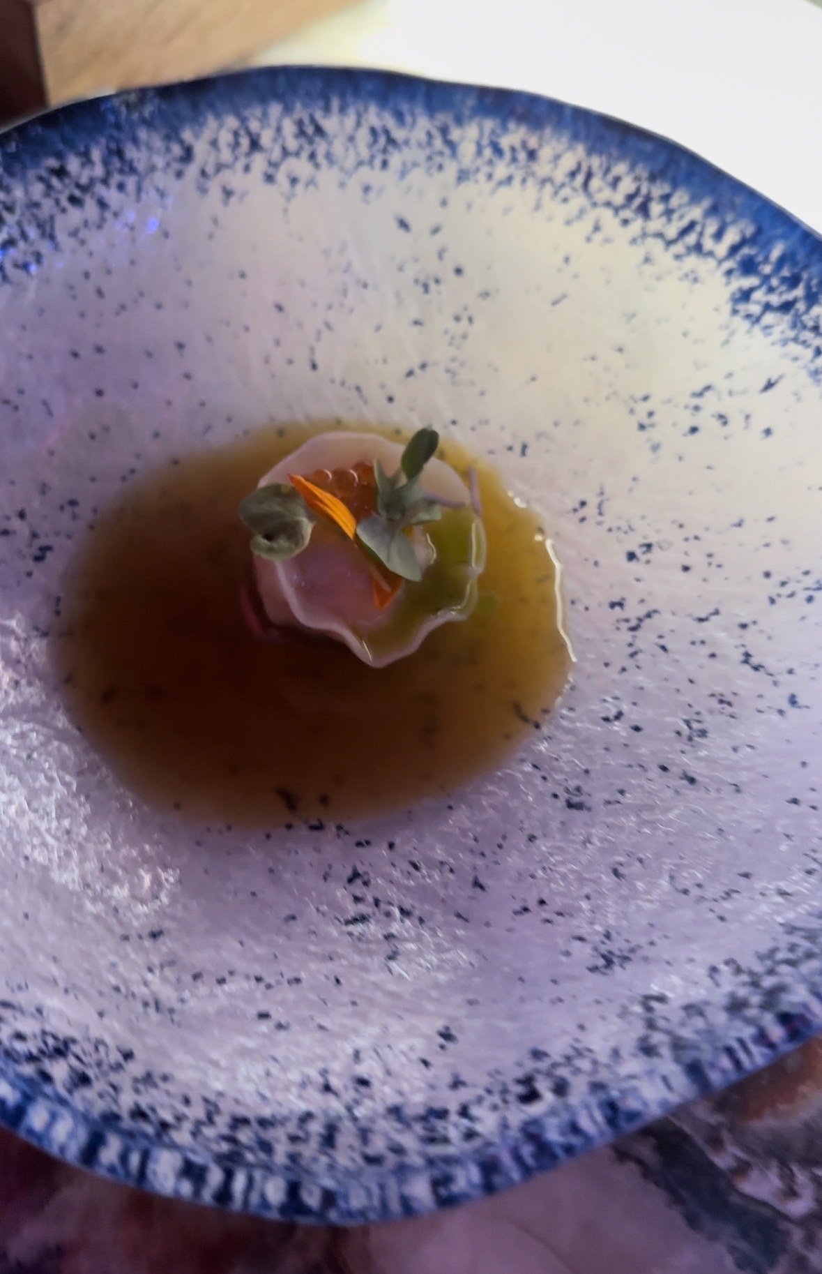 Para redondear este espectacular viaje por Japón, un delicioso caldo aromático con jengibre, anís estrella y lima kafir con ravioli de cangrejo.