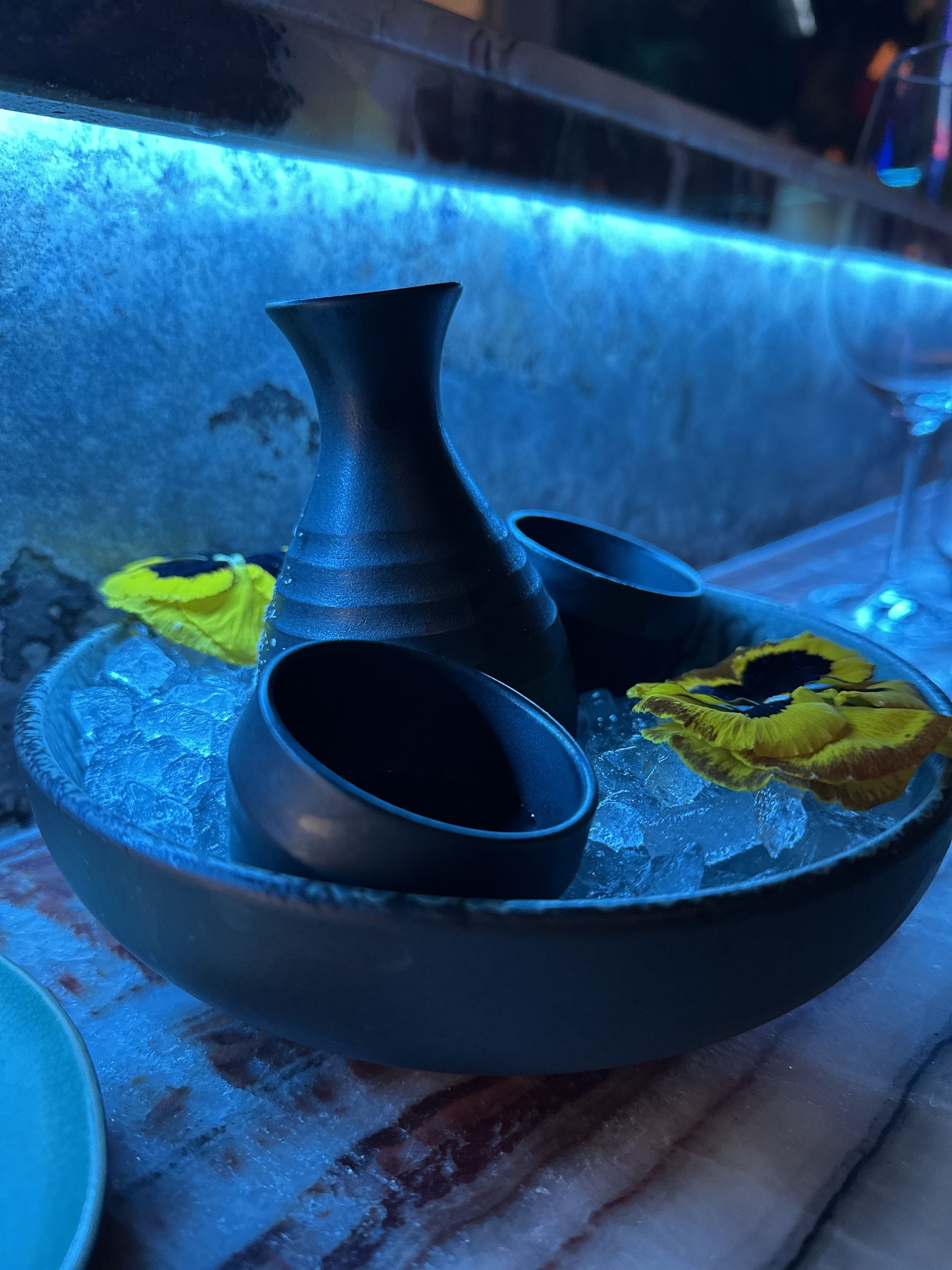 Un sushi bar donde tomas el menú omakase está realizado en ónix rojo que contrasta con el llamativo mármol luminious de las barras de coctelería.