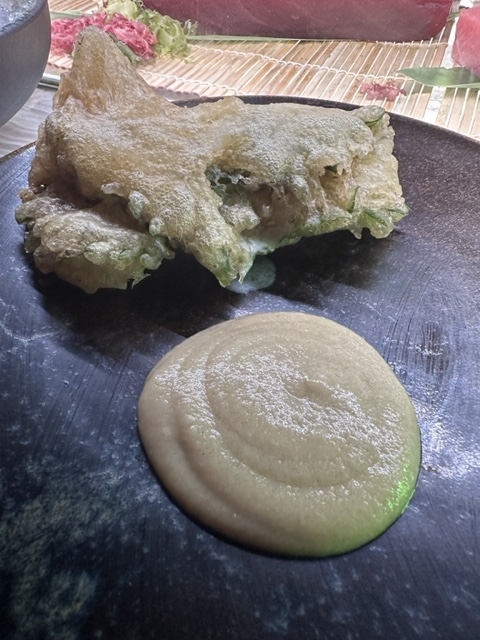 Lo peor del menú es la tempura de shiso con vieira trufada acompañada de mojo de piparras, que es demasiado grande por lo que la tempura se come el sabor del resto, eso sí, el mojo de piparras es para comercializarlo.