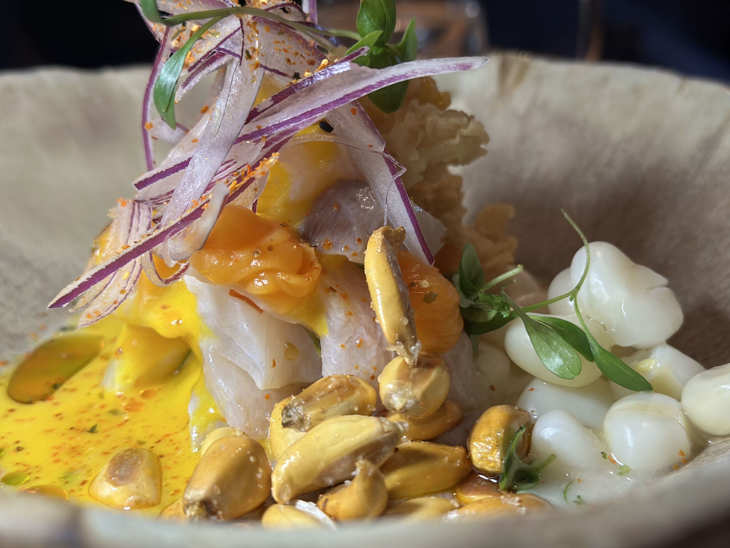 Y como no, si la especialidad de la casa es el ceviche, no te puedes ir sin probar uno de los cinco que ofrecen, sobre todo si la máxima del chef es que "no hay ceviche sin buen producto". En nuestro caso degustamos el ceviche kiiro (25€), en el que te encuentras la frescura de la corvina, la seta oreja de buda crocante y una base de leche de tigre, ají amarillo ahumado, puré de boniato acompañado de cancha, choclo y brotes de cilantro.