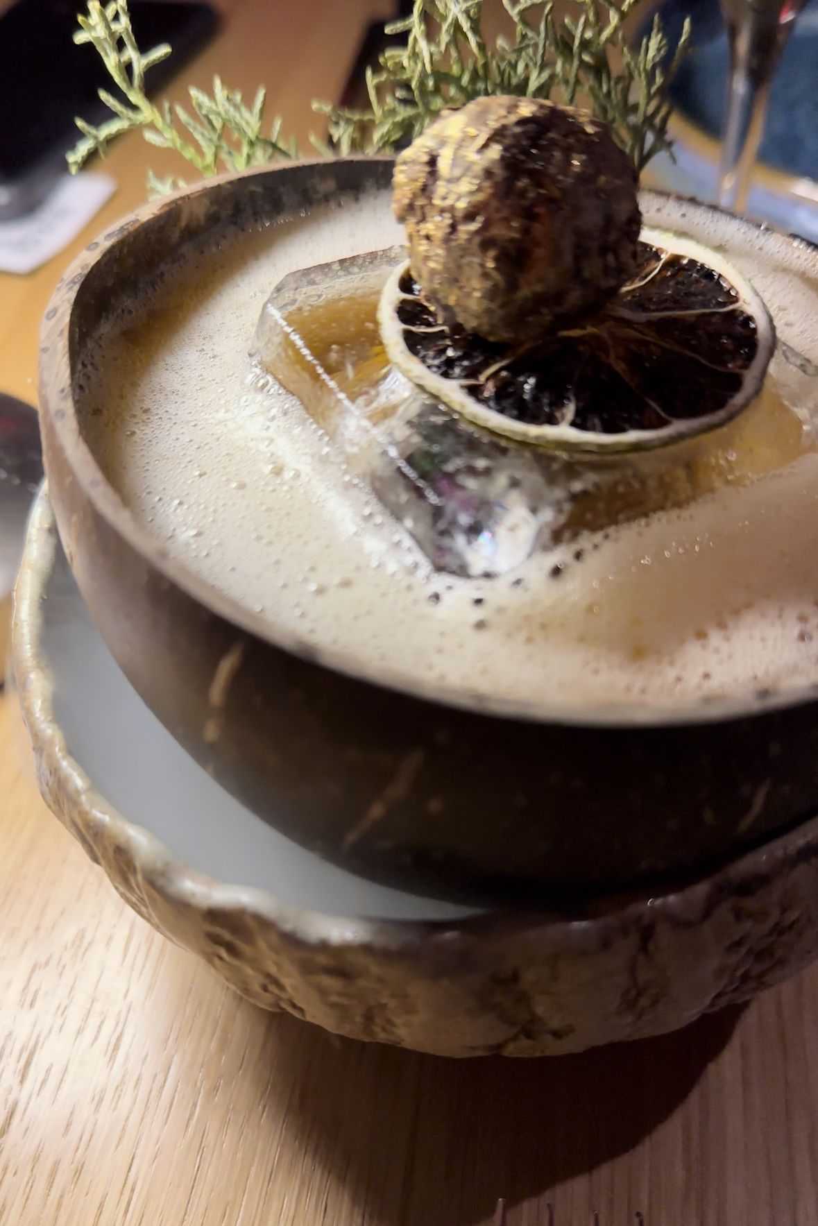 Por eso dicen que sus cócteles se beben y se comen porque pueden llevar ingredientes inesperados como aguacate, vinagre, toques ahumados y ceniza. En mi caso probé un buen cóctel raymi frutal (16€), un trago cítrico y especiado con ron, lícor de alcachofa, chicha de jora, cordial de cítricos, piña, haba tonka, trufa de cacao, maíz y oro. Su presentación es espectacular aunque resulta algo complicad de beber, pero siempre tendrás la opción de pedir una pajita.